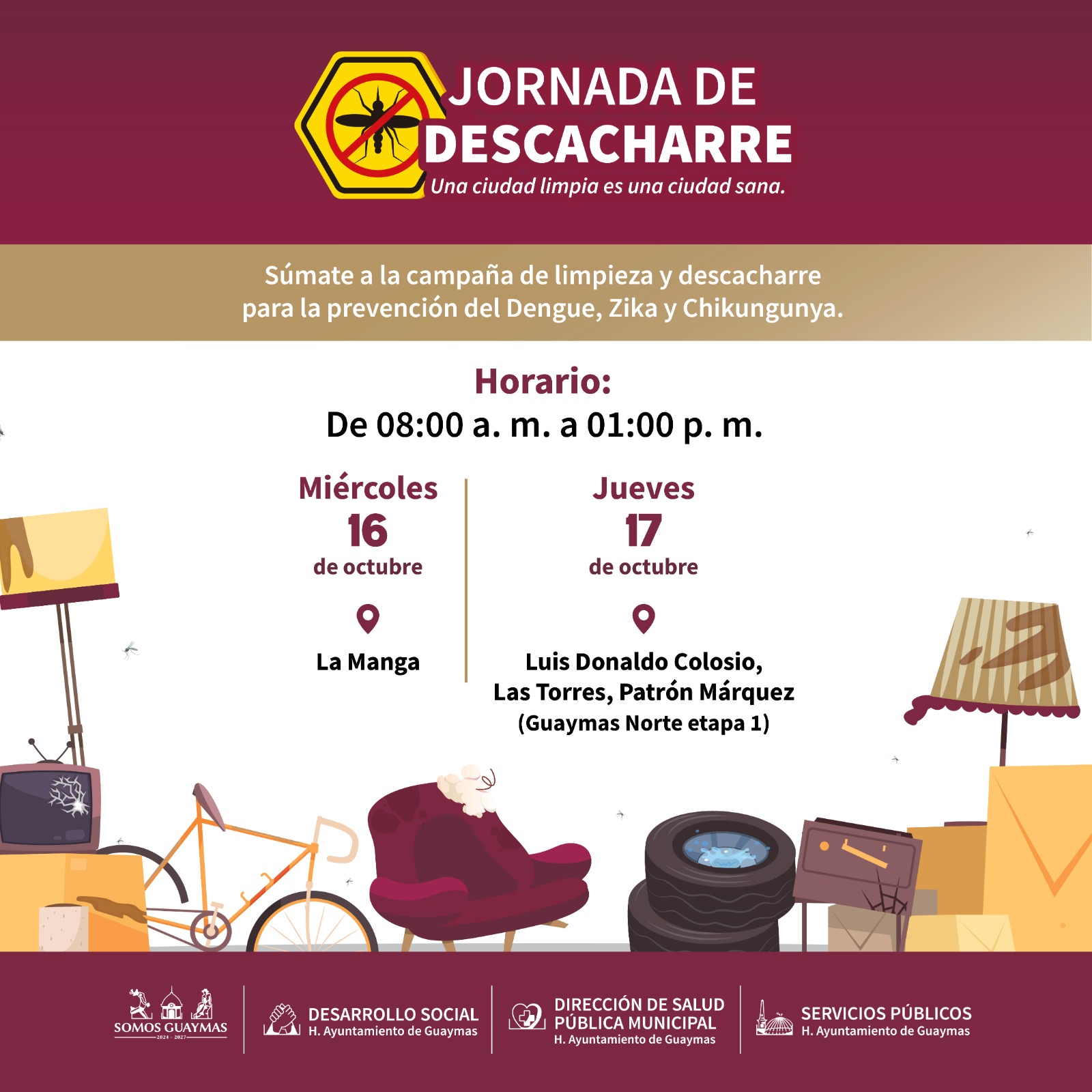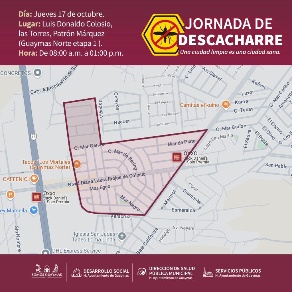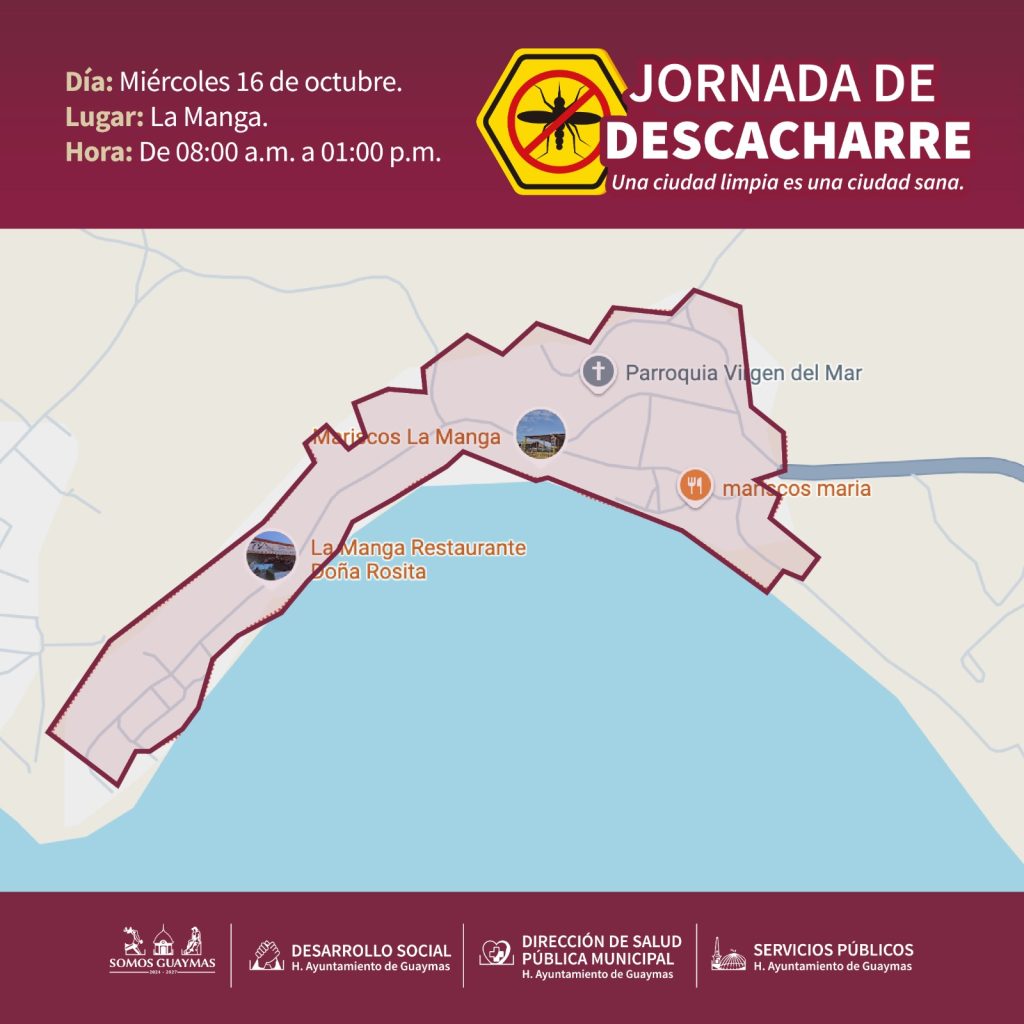El Ayuntamiento de Guaymas, junto con las direcciones de Desarrollo Social, Servicios PÃblicos y Salud PÃblica Municipal, realizarà una Jornada de Descacharre los dÃas 16 y 17 de octubre en La Manga y Guaymas Norte etapa I (Luis Donaldo Colosio, Las Torres y PatrÃn MÃrquez).