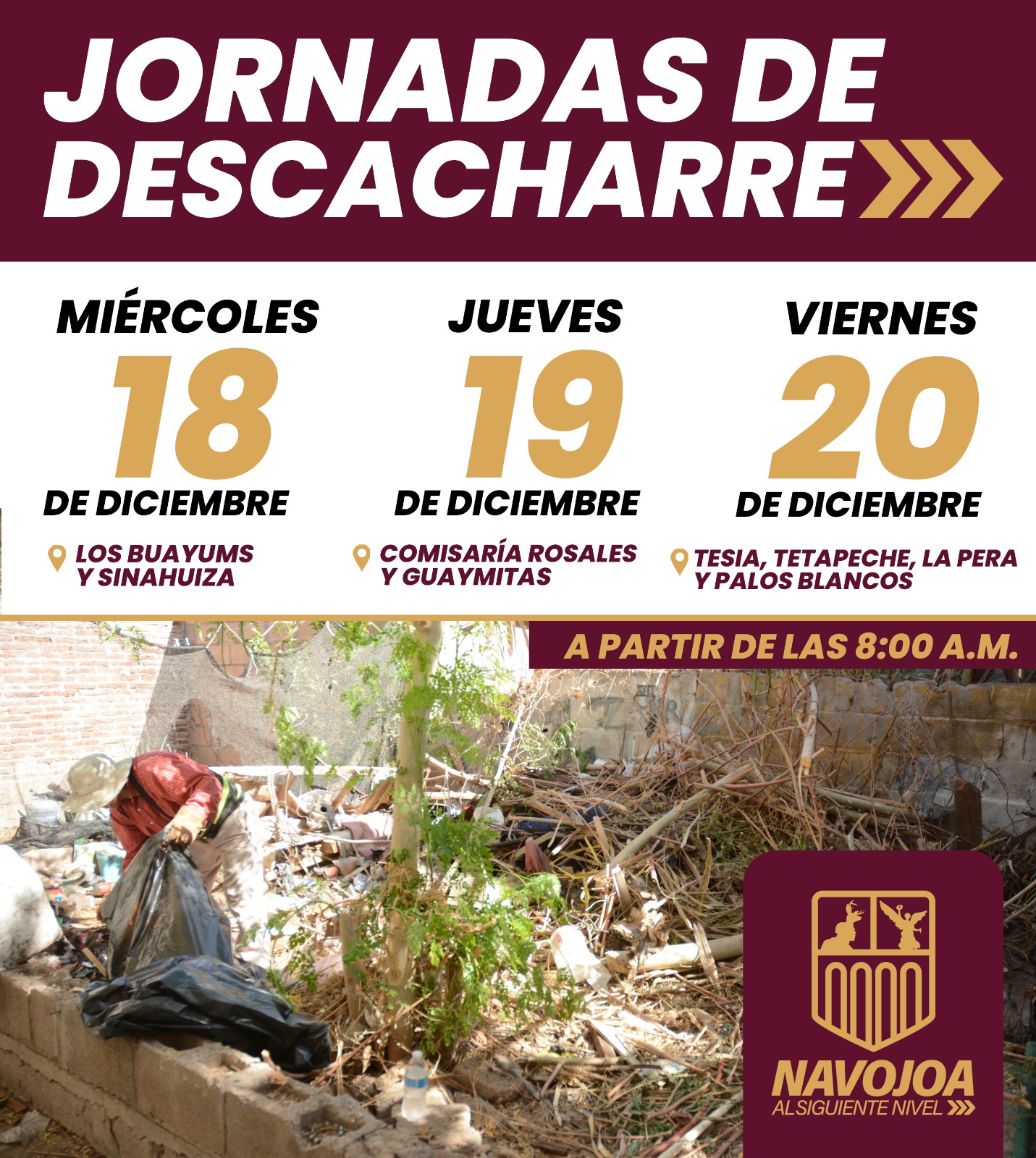 Este miÃrcoles 18, jueves 19 y viernes 20 de diciembre, participa en la Jornada de Descacharre organizada por el municipio de Navojoa. Tu apoyo es fundamental para eliminar criaderos de mosquitos y prevenir enfermedades. ÂUn esfuerzo conjunto por un Navojoa mÃs limpio y saludable!