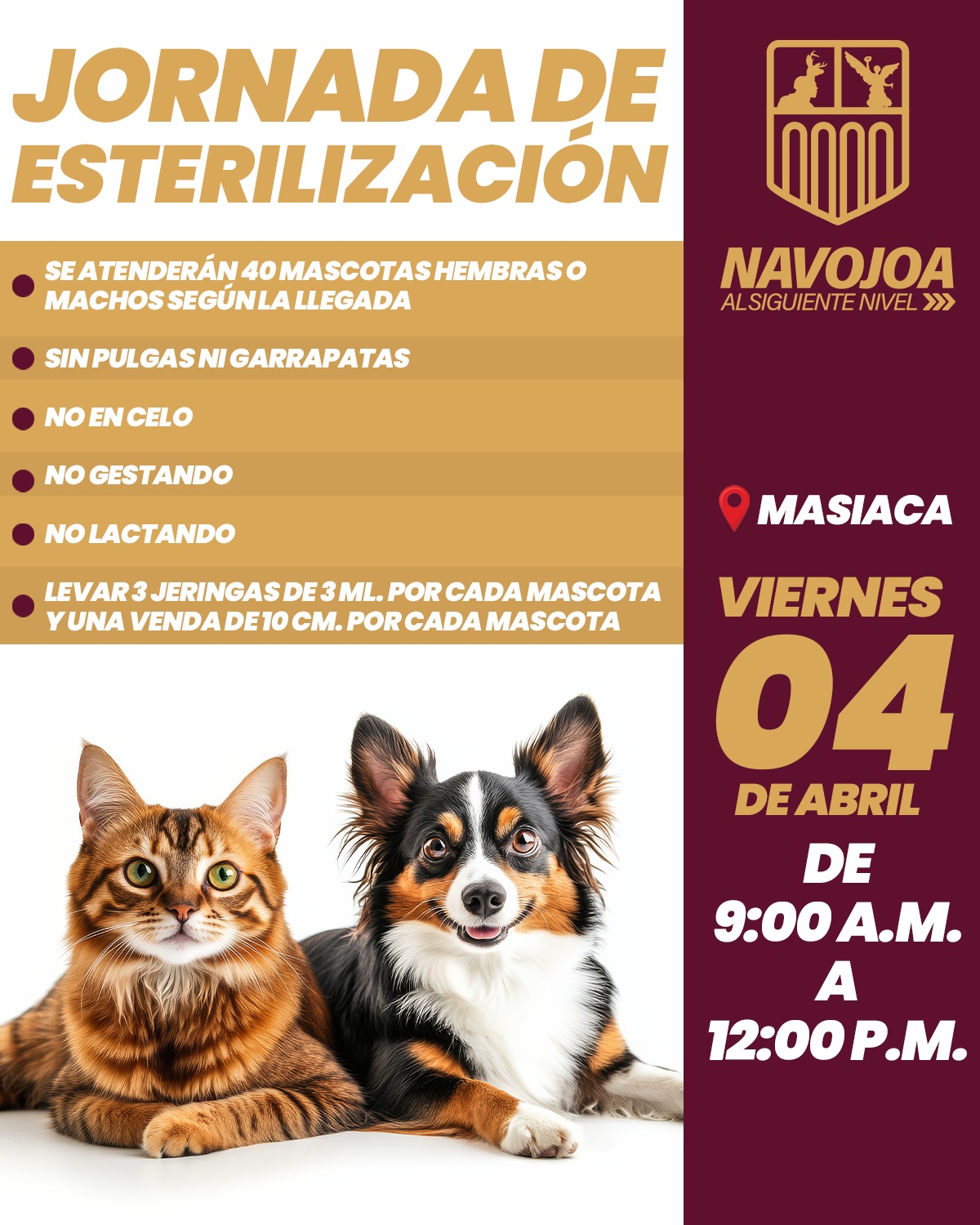 El Municipio de Navojoa invita a todos a participar en la Jornada de EsterilizaciÃn para perros y gatos, una excelente oportunidad para cuidar la salud de tus mascotas y contribuir al bienestar de la comunidad.