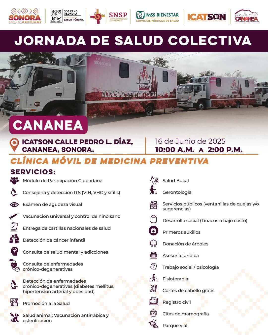 El Gobierno Municipal de Cananea, en colaboraciÃn con ICATSON y otras instituciones, organiza una Jornada de Salud Colectiva el prÃximo lunes 16 de junio, de 10:00 a.m. a 2:00 p.m., en las instalaciones de ICATSON Cananea (Calle Pedro L. DÃaz).