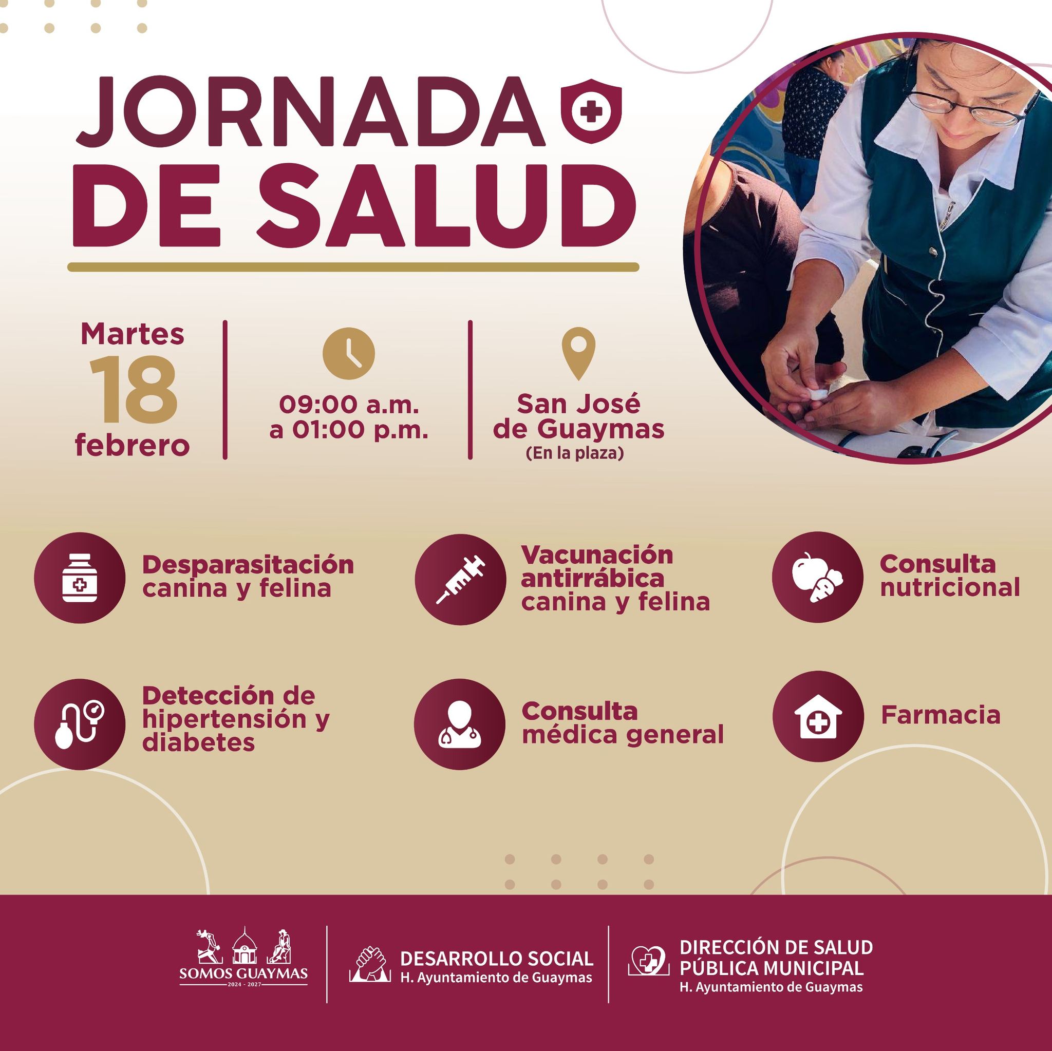 Este 18 de febrero, las familias de la colonia San Josà (Plaza) en Guaymas podrÃn disfrutar de una jornada de salud gratuita, que se llevarà a cabo de 9:00 a 13:00 horas. El objetivo de esta actividad es acercar los servicios preventivos a la comunidad y brindar atenciÃn mÃdica y servicios esenciales a todos los vecinos.