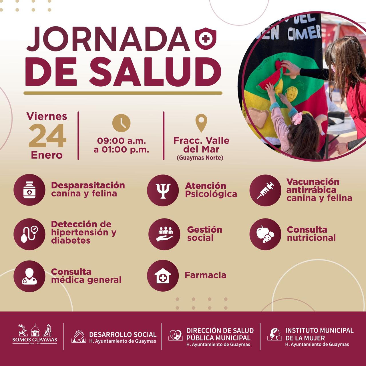 Este 24 de enero, el Ayuntamiento de Guaymas llevarà a cabo una Jornada de Salud gratuita en el fraccionamiento Valle del Mar (Guaymas Norte), con el objetivo de prevenir enfermedades y acercar servicios mÃdicos a las familias de la zona. La actividad se realizarà de 9:00 a 13:00 horas y contarà con servicios como desparasitaciÃn y vacunaciÃn de mascotas, detecciÃn de hipertensiÃn y diabetes, consultas mÃdicas generales, atenciÃn psicolÃgica, y asesorÃa nutricional.