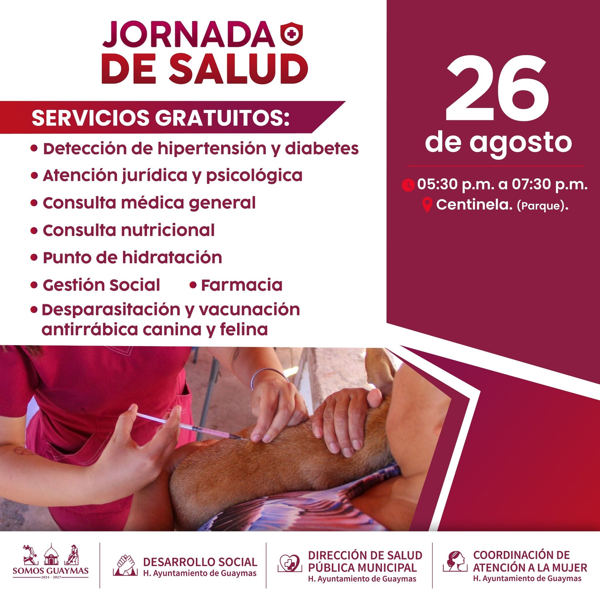 Este martes 26 de agosto, el Ayuntamiento de Guaymas llevarà a cabo una Jornada de Salud gratuita en el parque del sector Centinela, de 17:30 a 19:30 horas, con una amplia gama de servicios mÃdicos, atenciÃn social y apoyo jurÃdico.