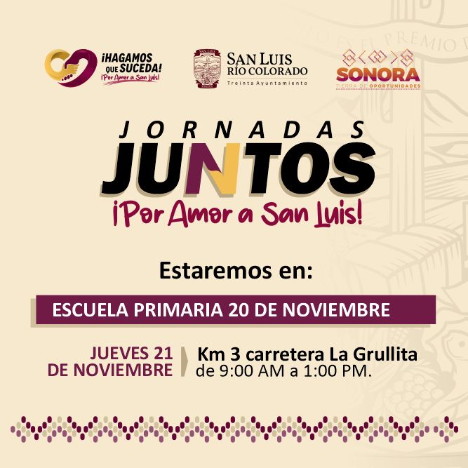 Por instrucciones del presidente municipal, CÃsar IvÃn Sandoval GÃmez, las jornadas âJuntos por Amor a San Luisâ se llevarÃn a cabo este jueves 21 de noviembre en la Escuela Primaria 20 de Noviembre (Km 3 al ejido La Grullita) de 9:00 a.m. a 1:00 p.m.