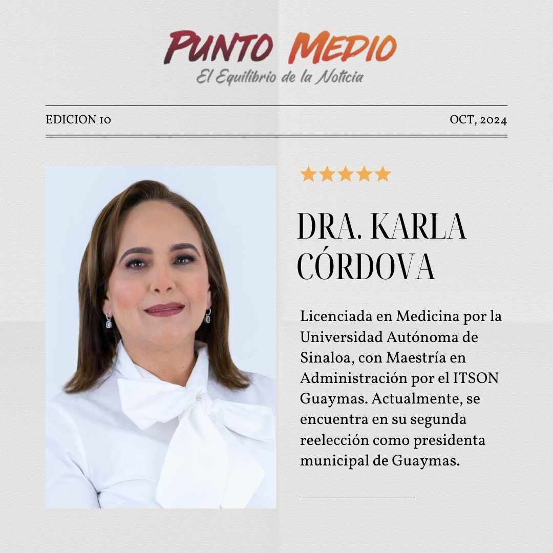 La alcaldesa de Guaymas, Karla CÃrdova GonzÃlez es un ejemplo claro de dedicaciÃn al servicio pÃblico y a la salud, con una trayectoria que ha sido forjada en el campo de la medicina, la administraciÃn pÃblica y el liderazgo local. Su formaciÃn acadÃmica y experiencia profesional la han preparado para enfrentar los retos de gobernar un municipio en un momento crucial para su desarrollo.