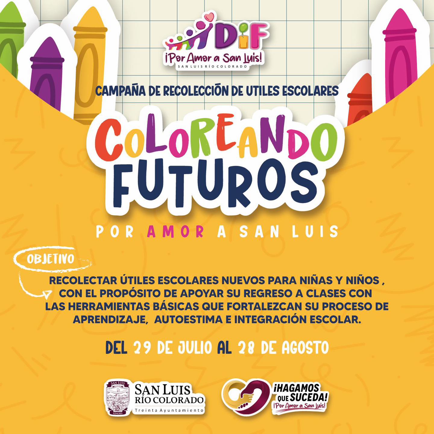 San Luis RÃo Colorado, Sonora.â Con el objetivo de apoyar a niÃas y niÃos en su regreso a clases, el DIF Municipal de San Luis RÃo Colorado, en coordinaciÃn con el 30 Ayuntamiento, dio inicio a la campaÃa «Coloreando Futuros», que estarà vigente del 29 de julio al 28 de agosto.