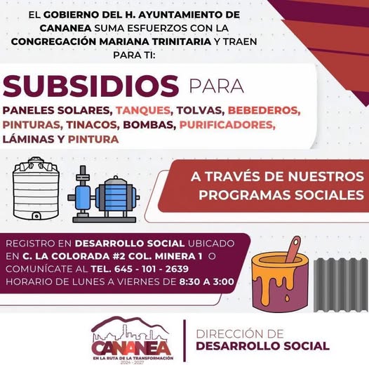 El Gobierno Municipal de Cananea, en coordinaciÃn con la CongregaciÃn Mariana Trinitaria, promueve un programa de apoyo social para que las familias puedan mejorar sus viviendas a travÃs de subsidios directos.