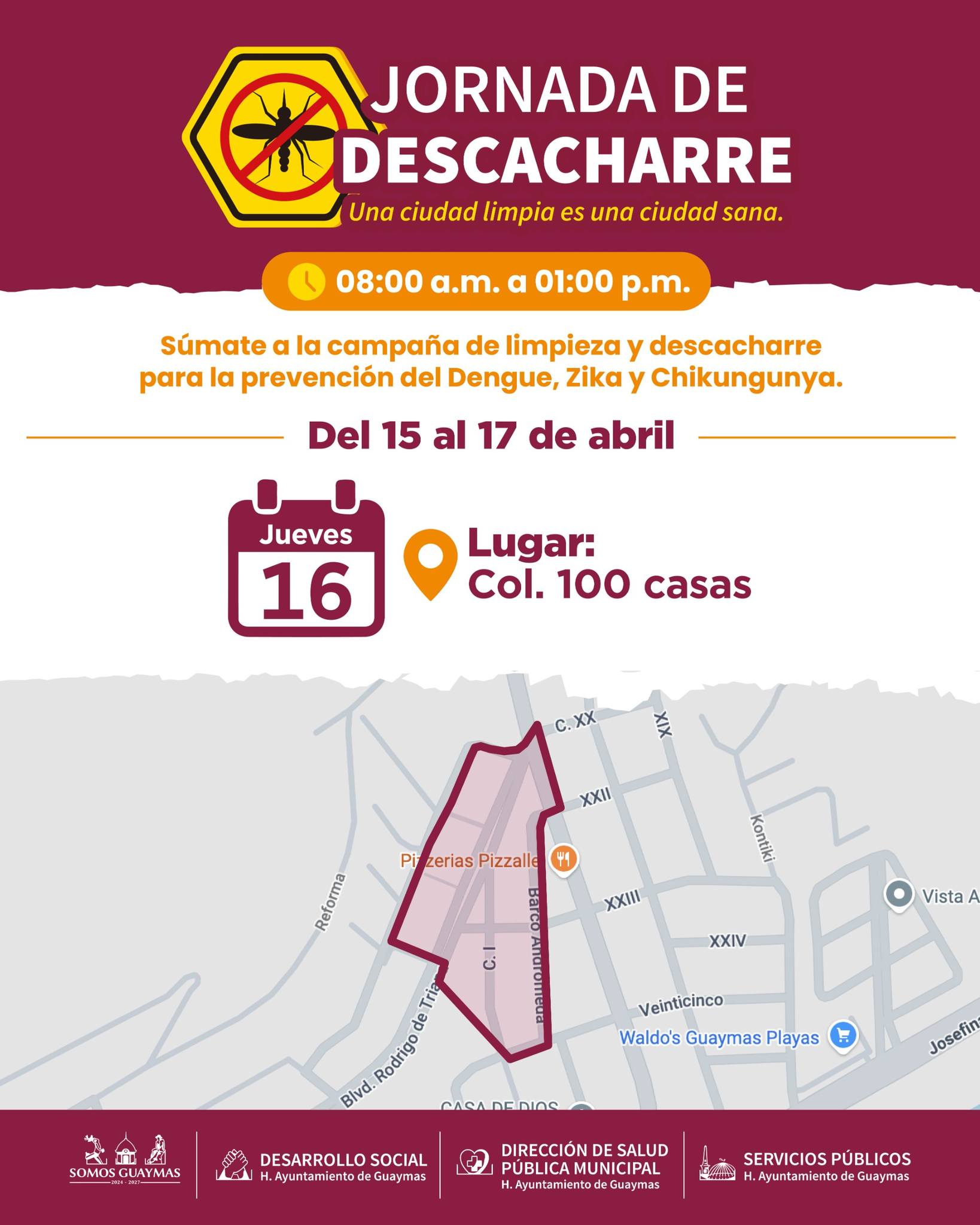 Las autoridades municipales informaron que el operativo se llevará a cabo en un horario de 8:00 AM a 1:00 PM bajo el siguiente calendario: este 15 de abril las acciones se concentran en la colonia Rastro; el jueves 16 de abril en 100 Casas; y el viernes 17 de abril en la colonia Centenario. Se exhorta a la ciudadanía a sacar a la banqueta llantas, botes, envases y cualquier artículo que pueda acumular agua, contribuyendo así a la salud de toda la comunidad.