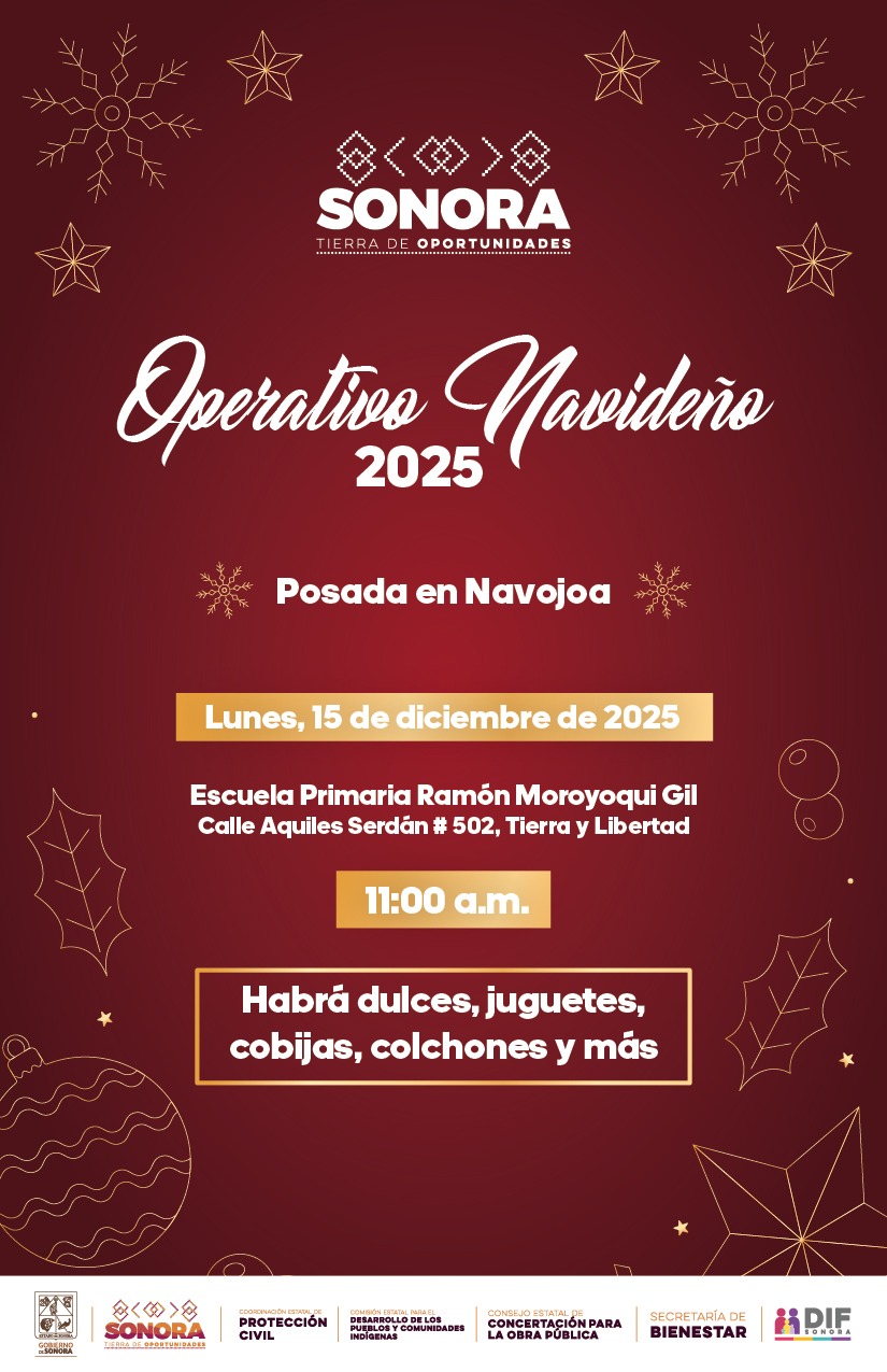 El espÃritu navideÃo aterriza hoy en la «Perla del Mayo». Como parte del Operativo NavideÃo 2025, el gobernador Alfonso Durazo MontaÃo, en coordinaciÃn con DIF Estatal y Municipal, encabezarà una gran posada comunitaria para llevar abrigo y alegrÃa a las familias que mÃs lo necesitan.
