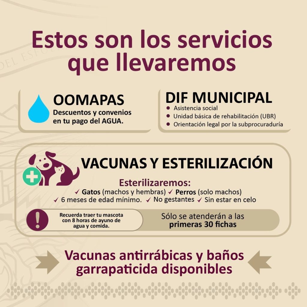 Entre ellos se incluye asistencia social y orientaciÃn legal por parte de DIF Municipal, mientras que la DirecciÃn de Salud PÃblica Municipal, a travÃs del Centro de Control Animal, tendrà disponibles esterilizaciones sin costo para las primeras 30 mascotas, ademÃs de vacunas y baÃos garrapaticidas.