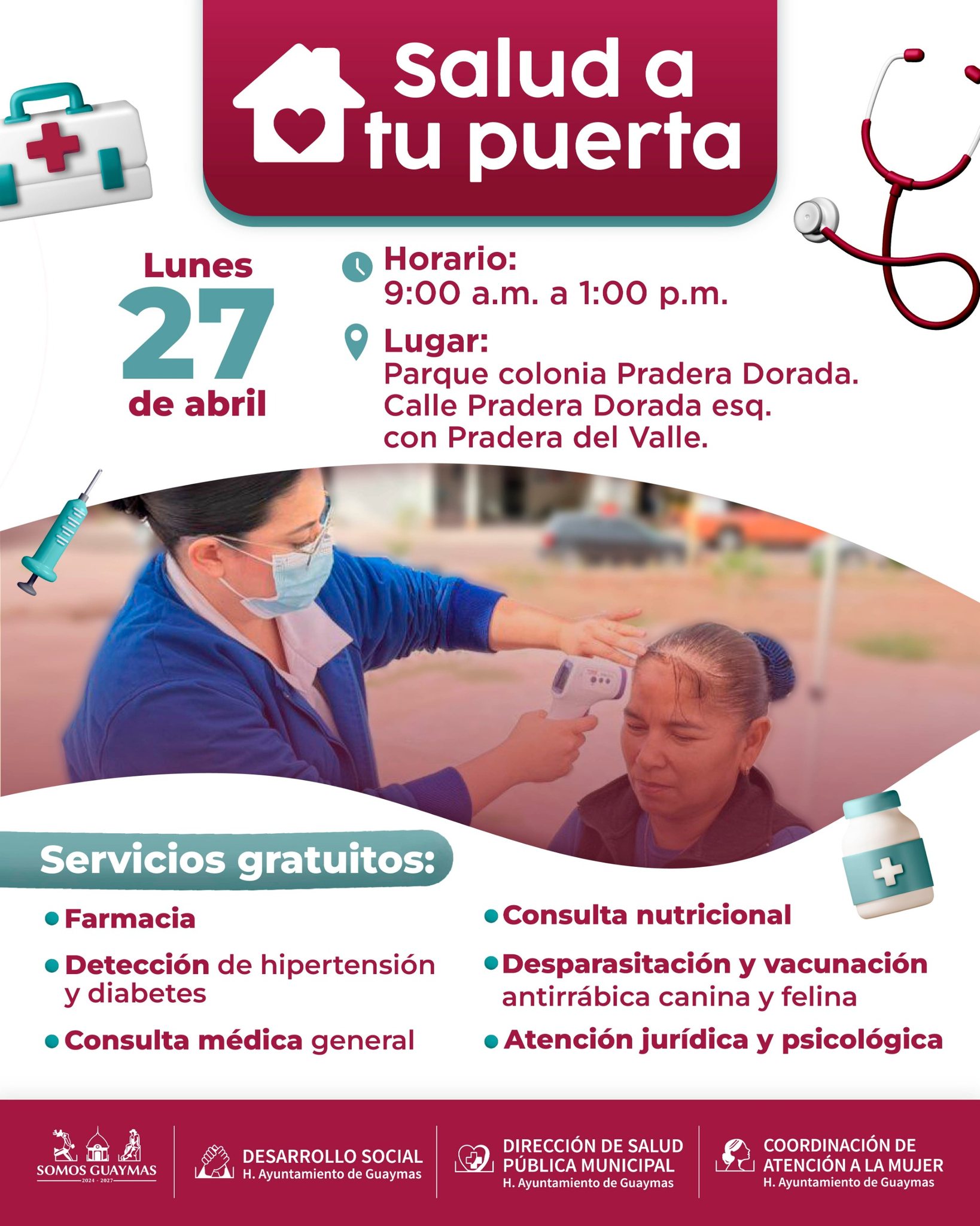 Guaymas, Sonora; a 25 de abril de 2026. Con el compromiso de fortalecer el bienestar de las familias, el Ayuntamiento de Guaymas, a través de Desarrollo Social, Salud Pública Municipal y la Coordinación de Atención a la Mujer, anunció una nueva edición del programa “Salud a tu puerta”.