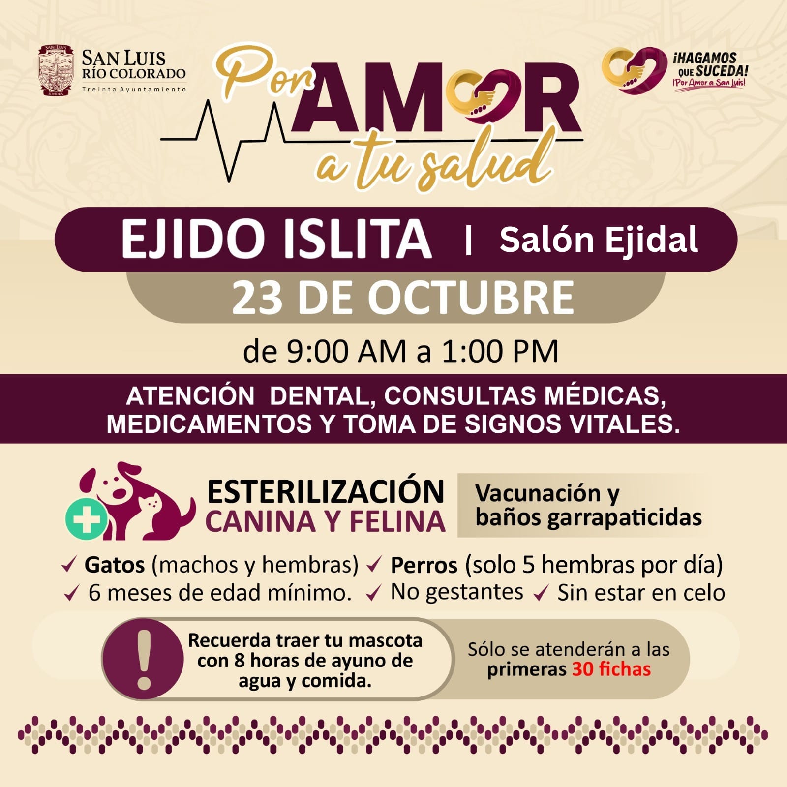 San Luis RÃo Colorado, Sonora (19 de octubre de 2025).- Con el objetivo de acercar los servicios mÃdicos a las comunidades del valle que, por la distancia, no pueden acudir con facilidad a la ciudad, el 30 Ayuntamiento de San Luis RÃo Colorado, a travÃs de la DirecciÃn de Salud PÃblica Municipal, llevarà la jornada «Por Amor a Tu Salud» al ejido Islita el prÃximo jueves 23 de octubre en el SalÃn Ejidal.