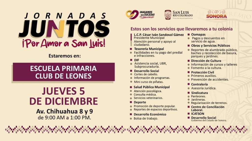 San Luis RÃo Colorado, Sonora (Diciembre 04 de 2024).- Descuentos en pago del Predial, recibo de agua de Oomapas, consultas mÃdicas, esterilizaciones a mascotas y cortes de cabello, son algunos de los servicios que los vecinos de la colonia Sonora podrÃn aprovechar maÃana jueves 05 de diciembre en las jornadas comunitarias âJuntos por Amor a San Luisâ.