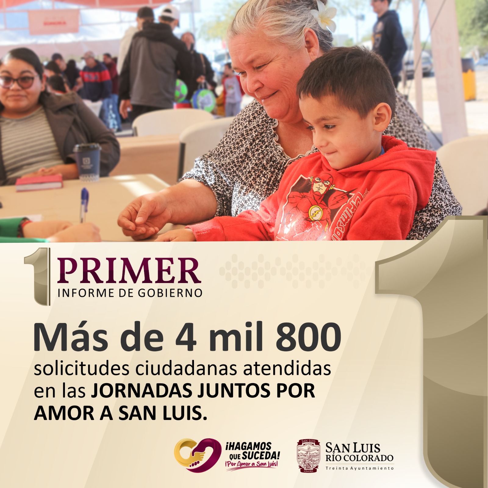 San Luis RÃo Colorado, Sonora (Septiembre 14 de 2025).- Motivados en atender y resolver las necesidades de las y los sanluisinos, todas las direcciones municipales se sumaron a la iniciativa âJuntos por Amor a San Luisâ acercando los servicios pÃblicos a las distintas colonias, con lo que se lograron atender mÃs de 4 mil 800 solicitudes ciudadanas.