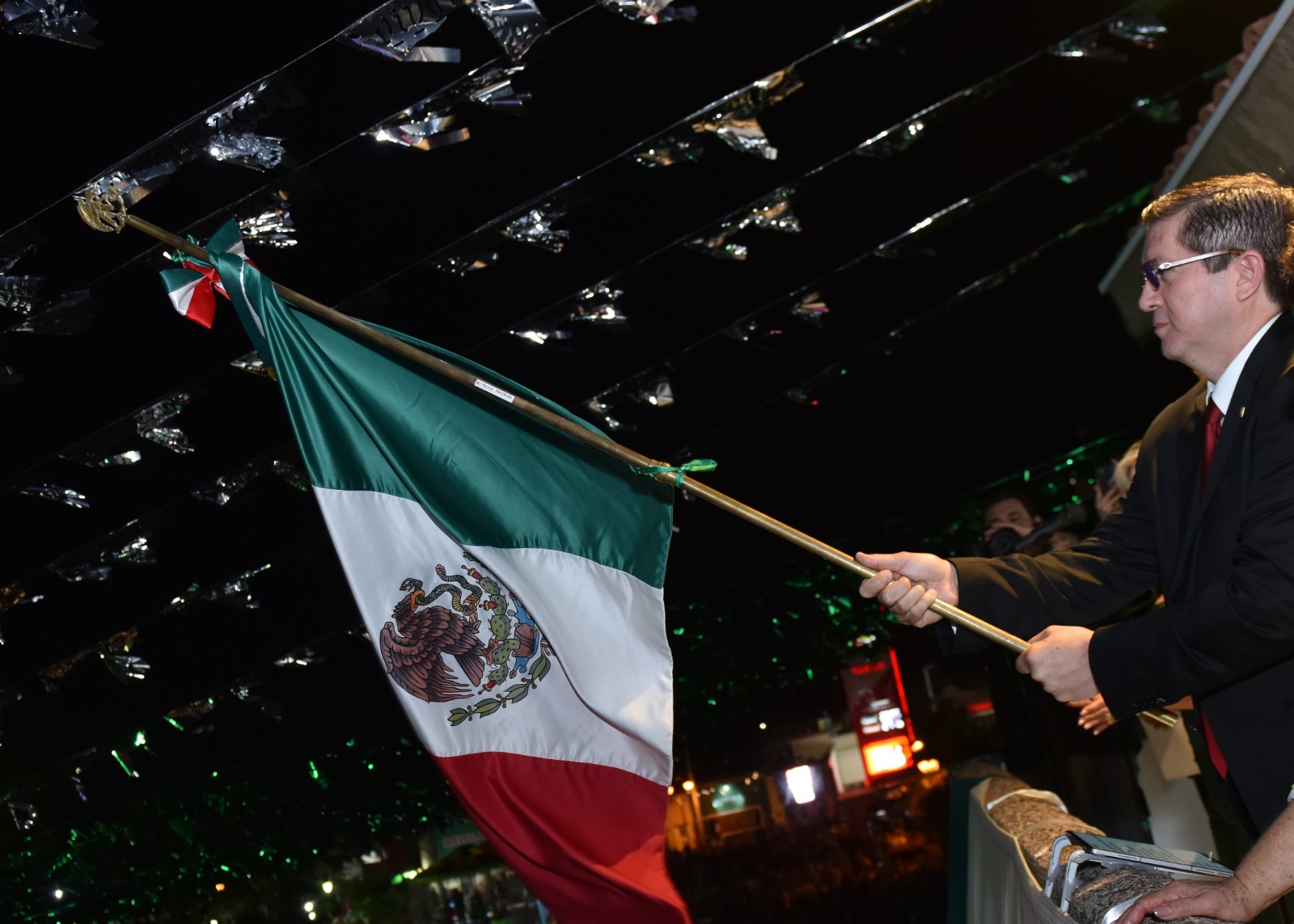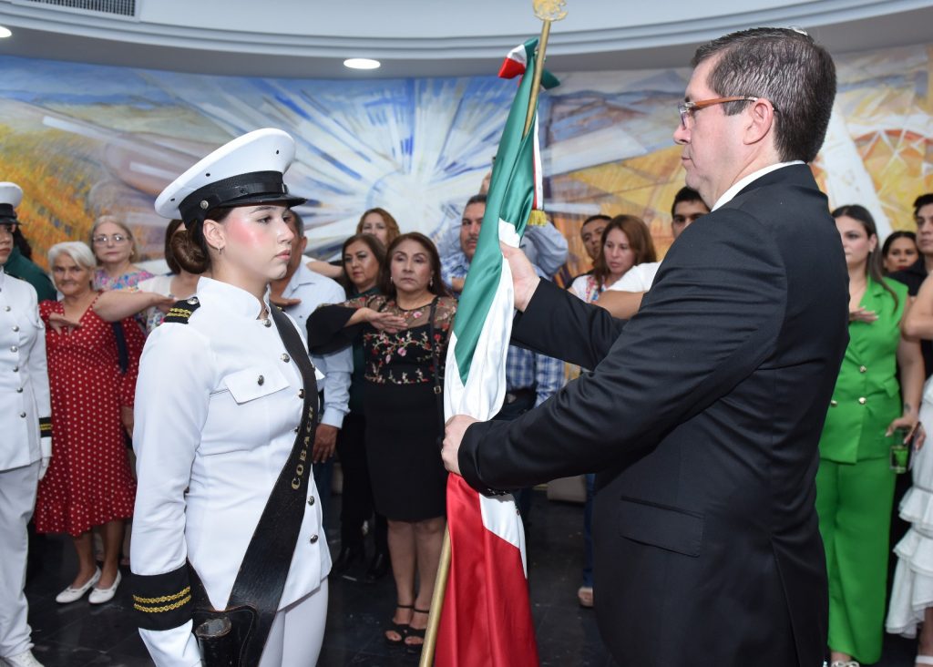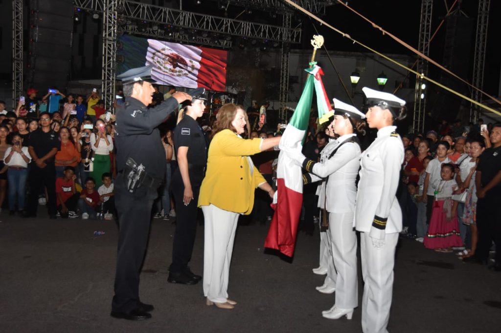 La celebraciÃn patria dio inicio a las 22:30 horas con la recepciÃn debajo del balcÃn presidencial de Palacio de la bandera nacional a la sÃndica procuradora, Gricelda Soto Almada, quien se encargà de entregarla a la escolta del Cobach y Ãsta al alcalde ElÃas Retes para la proclama oficial.
