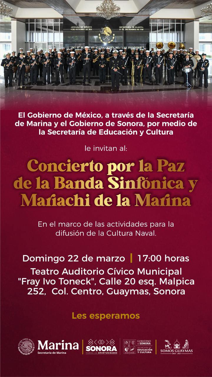 Guaymas, Sonora; 20 de marzo de 2026.- El Puerto de Guaymas se vestirà de gala este domingo 22 de marzo con la presentaciÃn estelar de la Banda SinfÃnica y el Mariachi de la SecretarÃa de Marina. Como parte de las actividades para la difusiÃn de la Cultura Naval, el H. Ayuntamiento invita a toda la ciudadanÃa al «Concierto por la Paz», un evento diseÃado para fortalecer el tejido social a travÃs del arte.