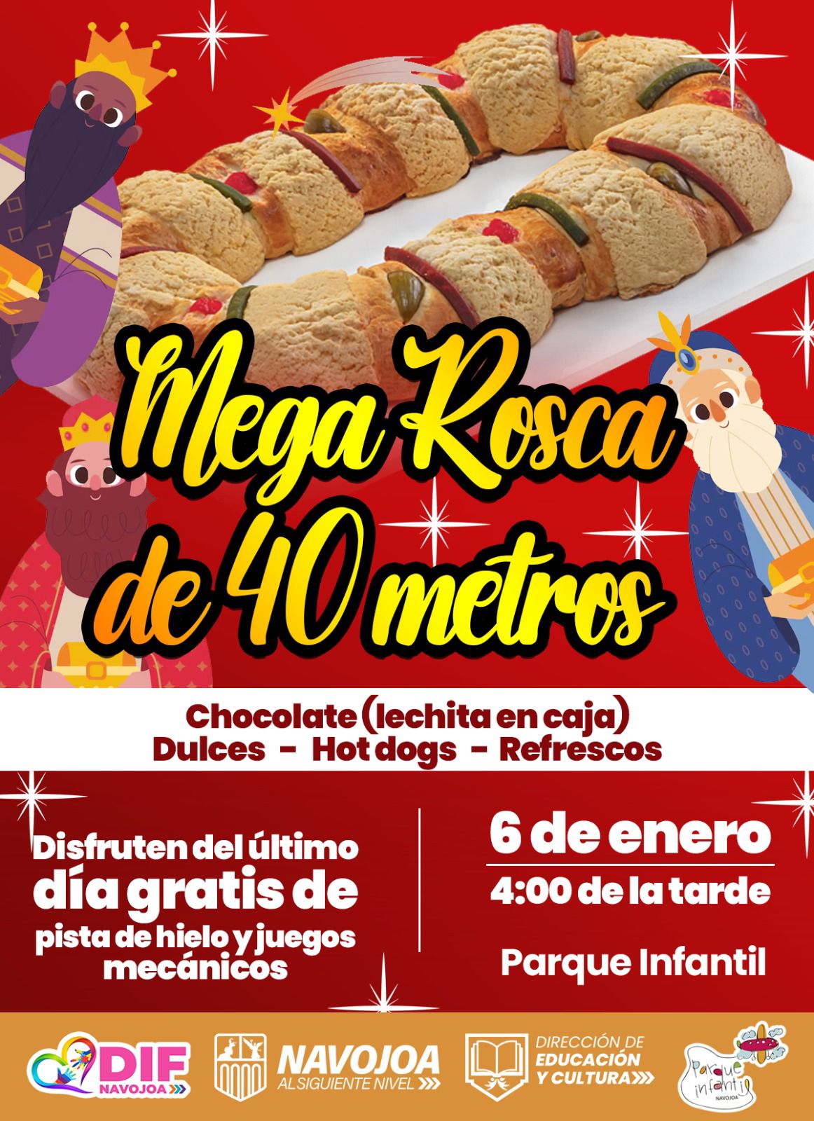 Como parte de las celebraciones del DÃa de Reyes, el Ayuntamiento de Navojoa realizarà este lunes 6 de enero un evento familiar con la elaboraciÃn de una Mega Rosca de 40 metros, abierta al pÃblico en general.