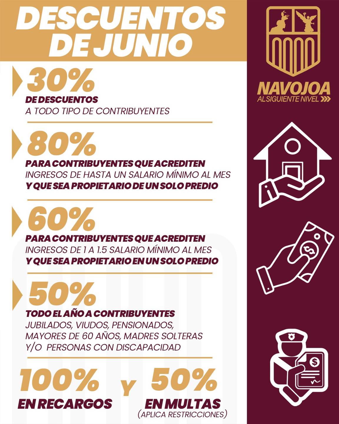 Con el objetivo de apoyar la economÃa familiar y fomentar la participaciÃn ciudadana en el desarrollo municipal, el Ayuntamiento de Navojoa ha anunciado una campaÃa de descuentos especiales en el pago del impuesto predial durante todo el mes de junio.