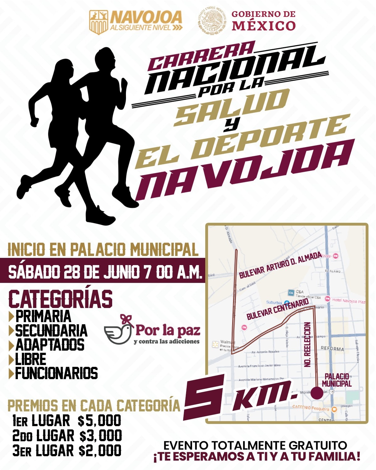 Este sÃbado 28 de junio, Navojoa serà sede de la Carrera Nacional por la Salud y el Deporte, un evento organizado para promover la salud, la paz y la prevenciÃn de las adicciones. Este evento busca fomentar una cultura de bienestar fÃsico y mental, mientras que tambiÃn impulsa la unidad comunitaria.