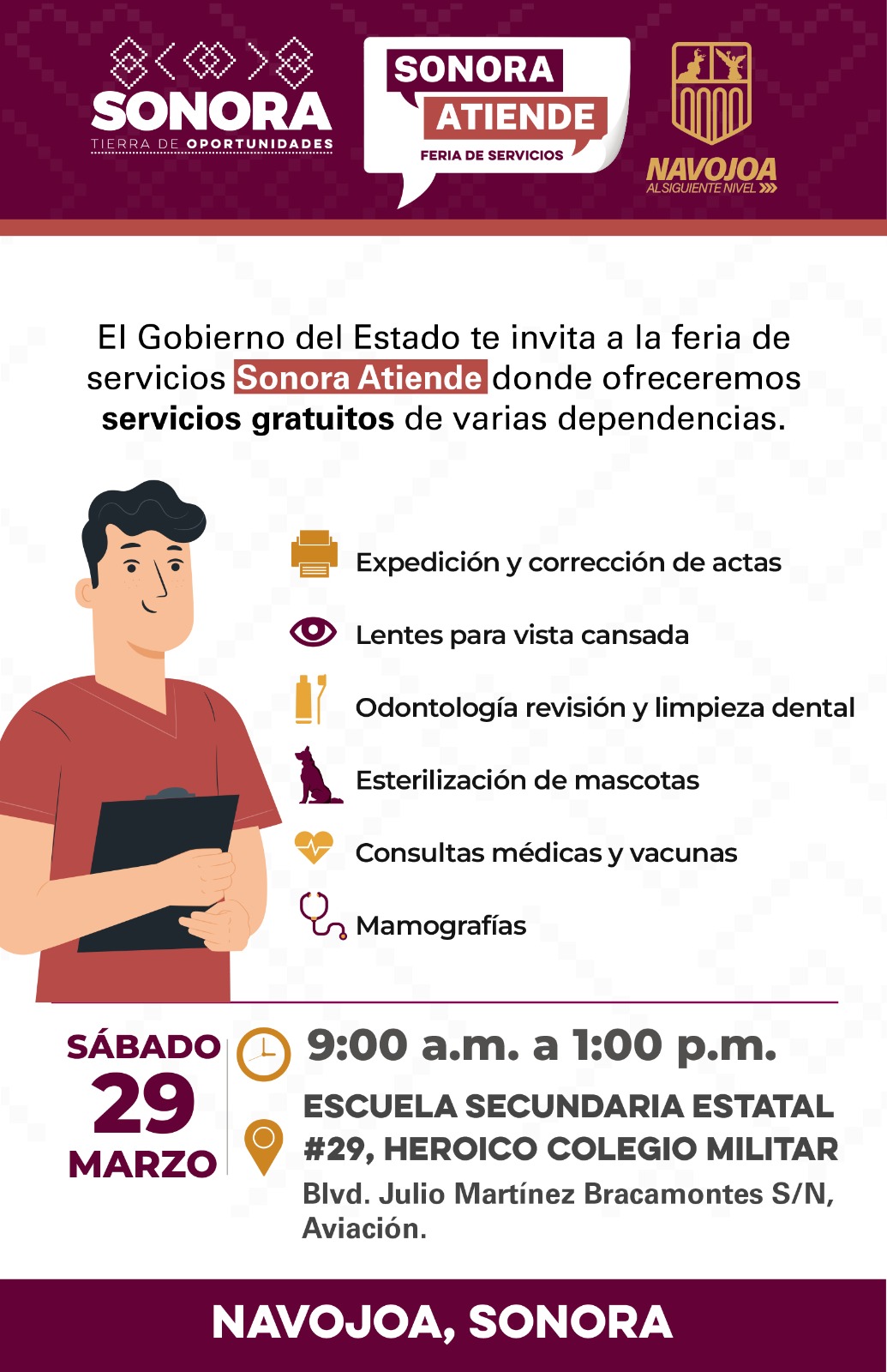 Navojoa, Sonora â Este sÃbado 29 de marzo, la ciudadanÃa de Navojoa tiene una cita importante con los servicios gratuitos que ofrecerÃn diversas dependencias del estado en el marco del programa «Sonora Atiende».