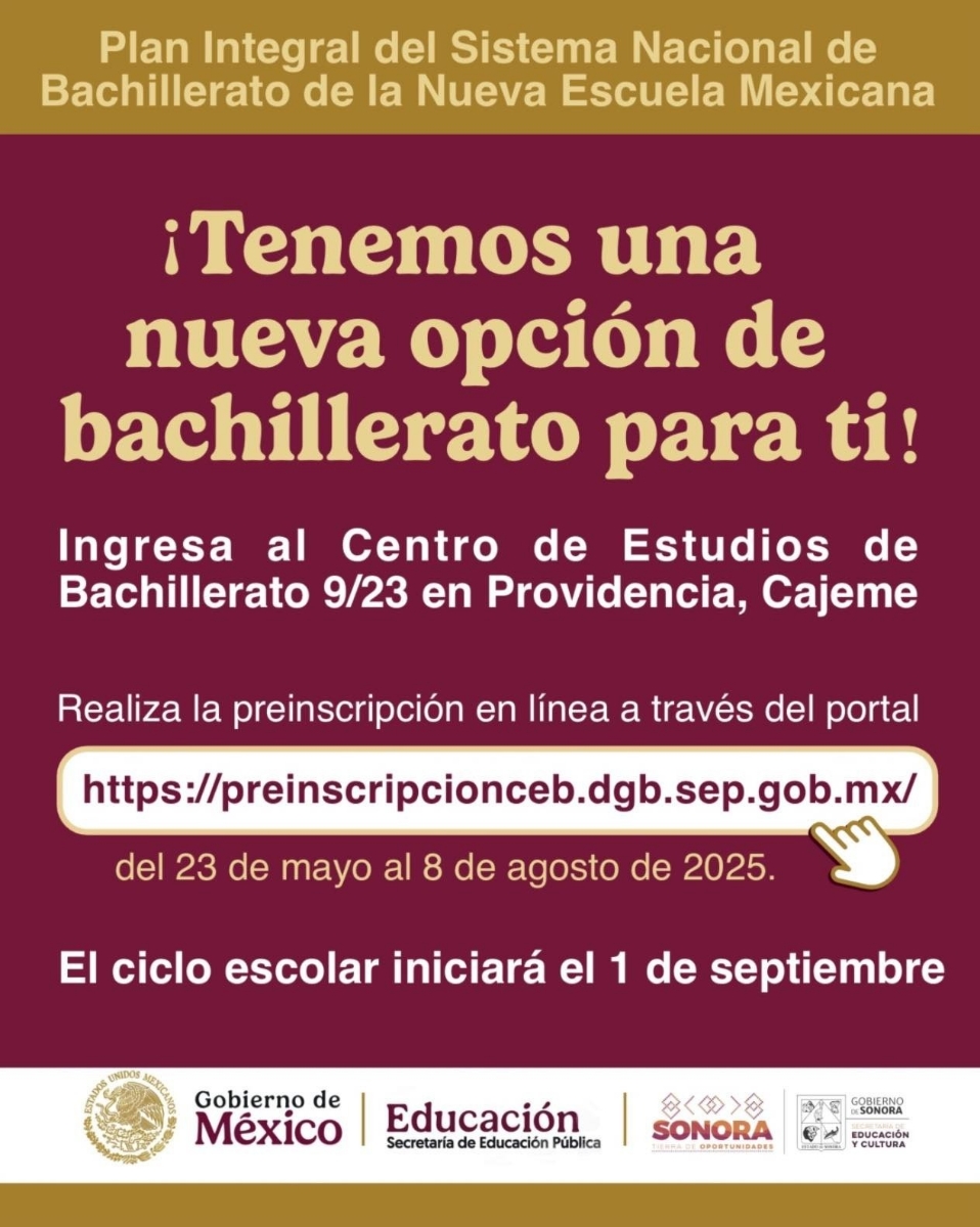 El Gobierno de Sonora y la SecretarÃa de EducaciÃn y Cultura invitan a los jÃvenes a formar parte de la primera generaciÃn del nuevo Centro de Estudios de Bachillerato 9/23 (CEB) en Providencia, Cajeme.