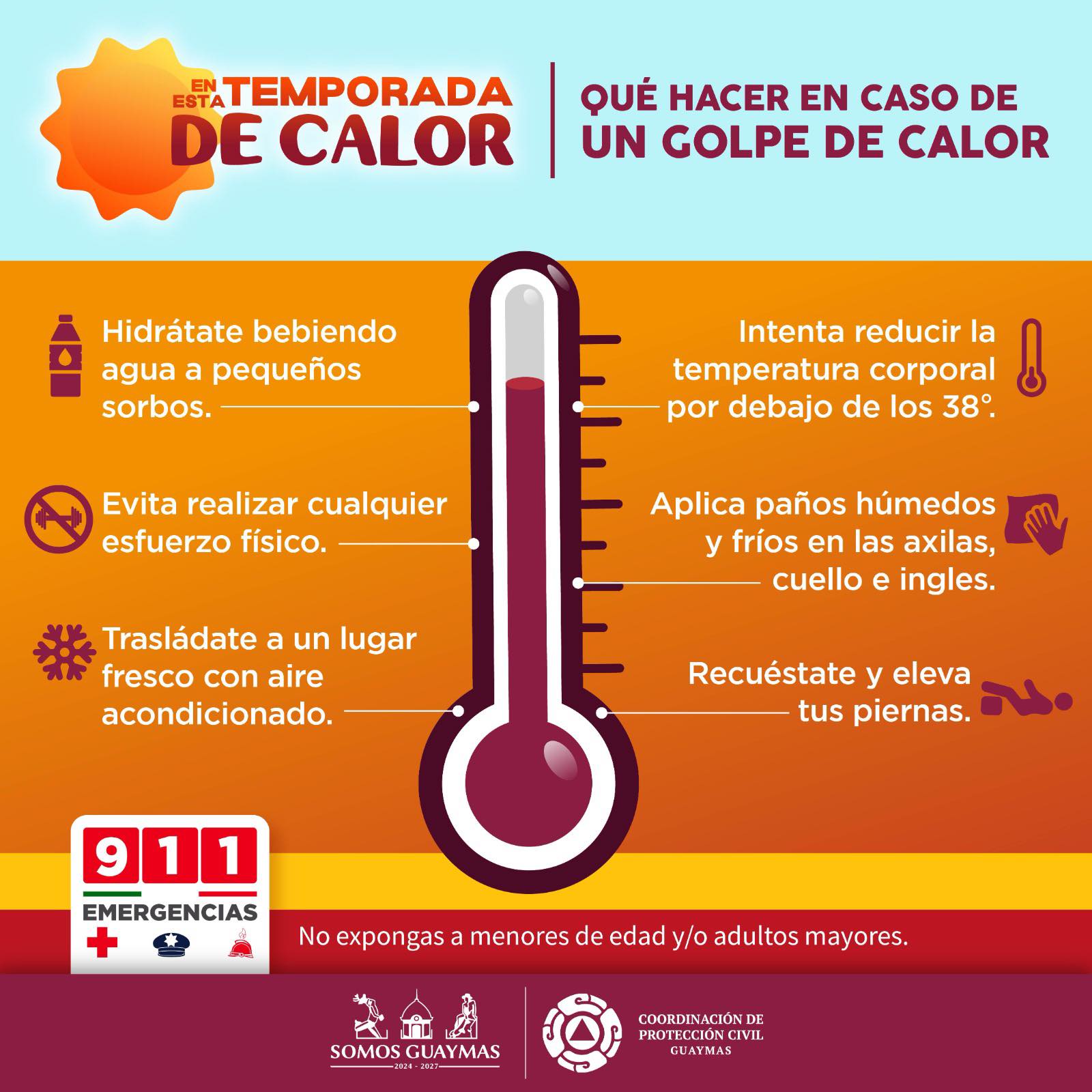 Ante el aumento de las temperaturas en Guaymas, la CoordinaciÃn Municipal de ProtecciÃn Civil ha emitido una serie de recomendaciones esenciales para que la ciudadanÃa pueda prevenir golpes de calor y otros padecimientos. El objetivo es claro: proteger la salud de las familias, con especial atenciÃn a los grupos mÃs vulnerables como niÃos, adultos mayores y personas con enfermedades crÃnicas.
