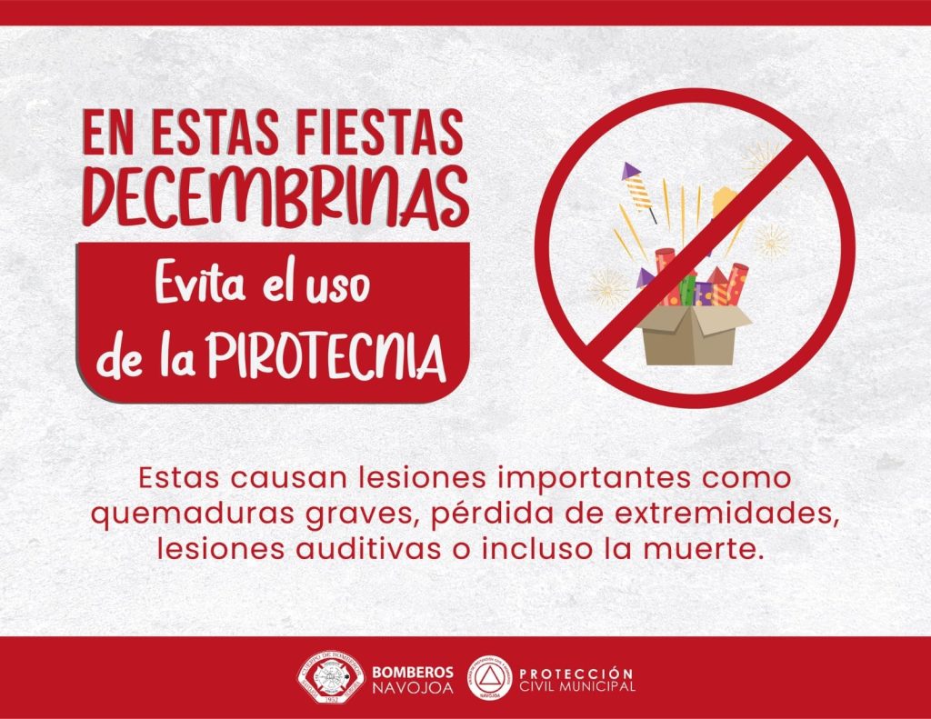 La CoordinaciÃn de ProtecciÃn Civil Municipal exhortà a los navojoenses a evitar el uso de la pirotecnia, o en caso de hacerlo que sea correcta y responsablemente, durante las fiestas navideÃas y de fin de aÃo, para prevenir accidentes como incendios en viviendas, heridas y quemaduras graves en las personas e incluso la muerte.