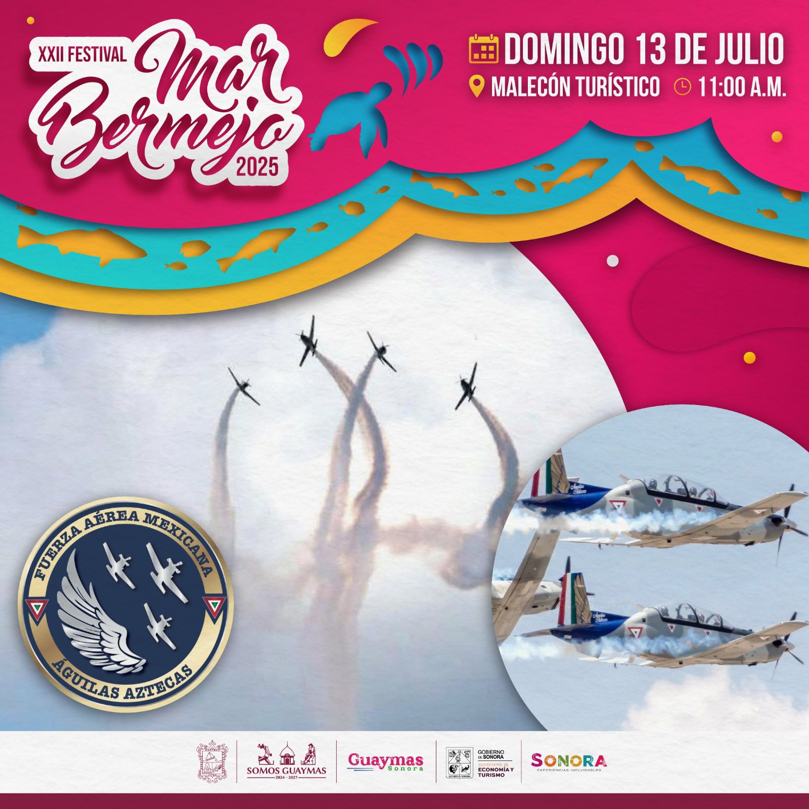 TEl Ayuntamiento de Guaymas invita a la comunidad a disfrutar del espectÃculo aÃreo de la Escuadrilla AcrobÃtica âÃguilas Aztecasâ de la Fuerza AÃrea Mexicana, que se presentarà por primera vez en Sonora durante el XXII Festival Mar Bermejo 2025.