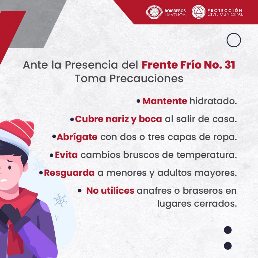 âJunto con la CoordinaciÃn Estatal de ProtecciÃn Civil permaneceremos alertas por cualquier emergencia, incluyendo recorridos de Bomberos por zonas del centro y otros sectores donde suelen refugiarse personas en calidad de calleâ, comentÃ, âes instrucciÃn del alcalde Jorge Alberto ElÃas Retes aplicar todos los protocolos necesarios para salvaguardar la vida de los navojoensesâ.