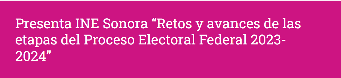 En el marco del Proceso Electoral Concurrente 2023-2024, la Junta Local Ejecutiva (JLE) del Instituto Nacional Electoral (INE) en el estado de Sonora llevà a cabo ante integrantes del Consejo Local; dirigencias estatales de los partidos polÃticos; lÃderes de organismos y cÃmaras empresariales; funcionarios del gobierno del estado y municipales; instituciones educativas; mandos militares, territoriales, navales y aÃreos; directivos de medios de comunicaciÃn e integrantes de la ComisiÃn Local de Vigilancia, la presentaciÃn de los âRetos y avance de las etapas del Proceso Electoral Federal 2023-2024â.