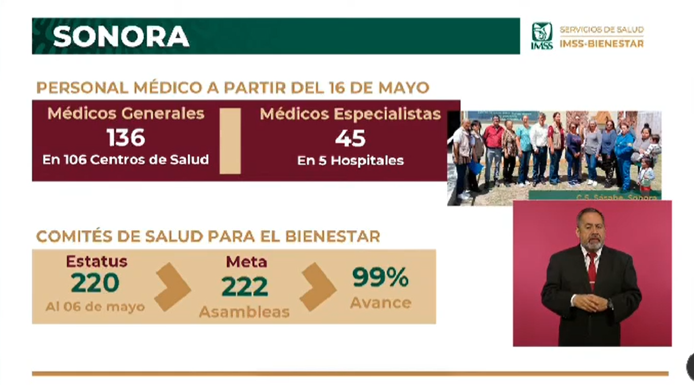 Sonora, MÃxico; a 07 de mayo del 2024.- Durante la Conferencia de Prensa del Gobierno de MÃxico, que encabeza el presidente AndrÃs Manuel LÃpez Obrador, el director general IMSS Bienestar, Zoà Alejandro Robledo Aburto, presentà el programa de arribo de personal mÃdico a Sonora, con el que se contarà a partir del 16 de mayo, siendo 136 mÃdicos generales en 106 centros de salud y 45 mÃdicos especialistas en cinco hospitales.