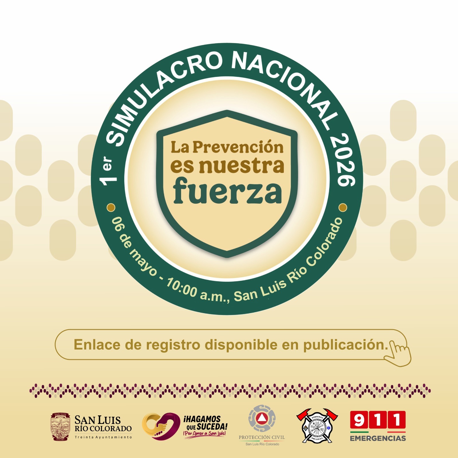 San Luis Río Colorado, Sonora (Abril 15 de 2026).- El 30 Ayuntamiento a través de la Dirección de Protección Civil y Bomberos Municipales invita a la ciudadanía, instituciones educativas, empresas y organismos públicos y privados a participar en el Primer Simulacro Nacional 2026, que se llevará a cabo el miércoles 06 de mayo de 2026 a las 10:00 horas en esta ciudad.