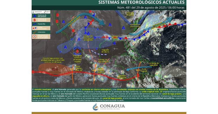 El Servicio MeteorolÃgico Nacional (SMN) advirtià que este jueves 29 de agosto se esperan lluvias muy fuertes en Sonora, con acumulaciones de entre 50 a 75 milÃmetros, acompaÃadas de actividad elÃctrica, posibles granizadas y fuertes rachas de viento de hasta 60 km/h.