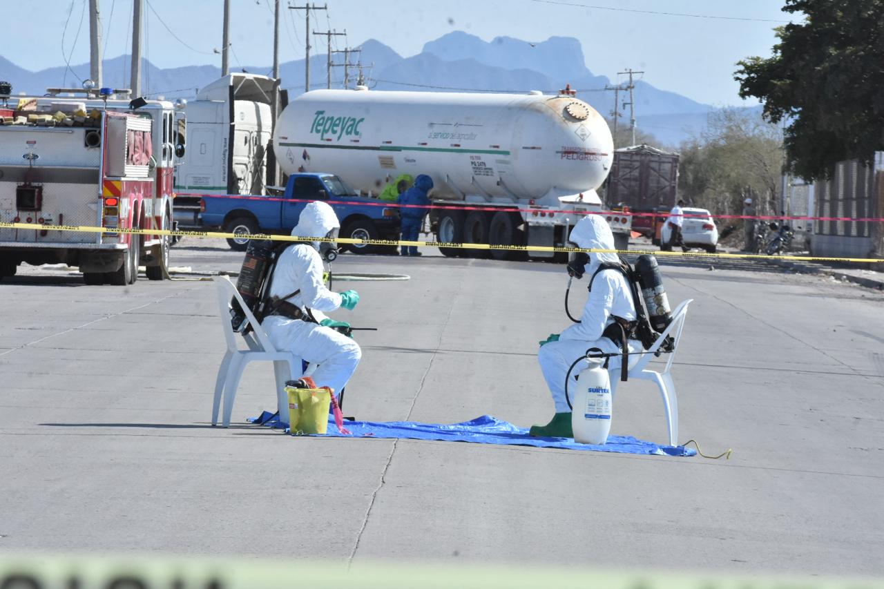 Navojoa, Sonora, 29 de enero 2024.- Apenas una hora con tres minutos llevà al personal de bomberos y cuerpos de emergencias controlar una fuga de amoniaco producida luego de registrarse el choque entre una pipa que transportaba el producto y un vehÃculo pick up, lo que obligà a acordonar la zona.