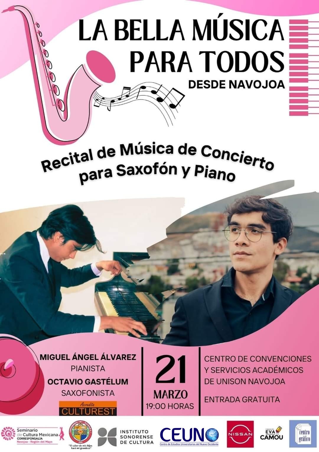 ÂNo te pierdas este maravilloso evento musical en el Centro de Convenciones y Servicios AcadÃmicos de la Unison Navojoa! Ven y sumÃrgete en la belleza de la mÃsica de concierto para saxofÃn y piano.