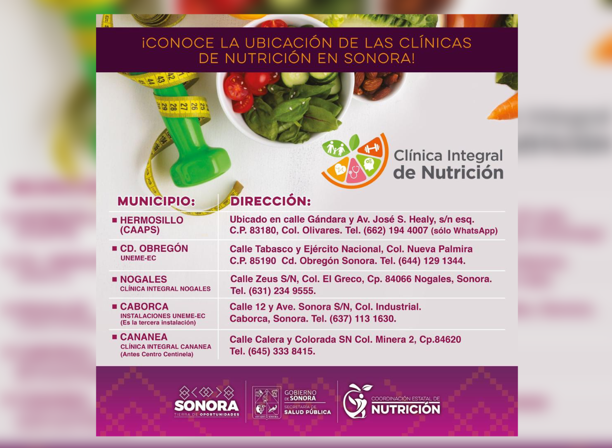 La SecretarÃa de Salud en Sonora cuenta con cinco clÃnicas integrales de nutriciÃn, en las cuales se atienden a personas de todas las edades, desde la niÃez hasta la adultez, para mejorar su estilo de vida y en donde profesionales en nutriciÃn, medicina general, enfermerÃa y trabajo social realizan una atenciÃn personalizada a cada paciente y con esto se brinda un servicio de calidad.