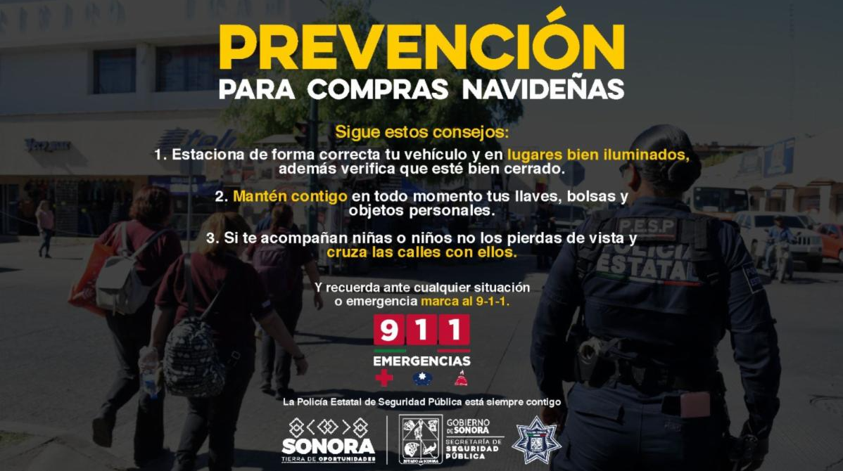 Para prevenir que la ciudadanÃa sea vÃctima de delitos al realizar las compras de fin de aÃo, la SecretarÃa de Seguridad PÃblica (SSP) de Sonora, a travÃs de la PolicÃa Estatal, emitià importantes recomendaciones.