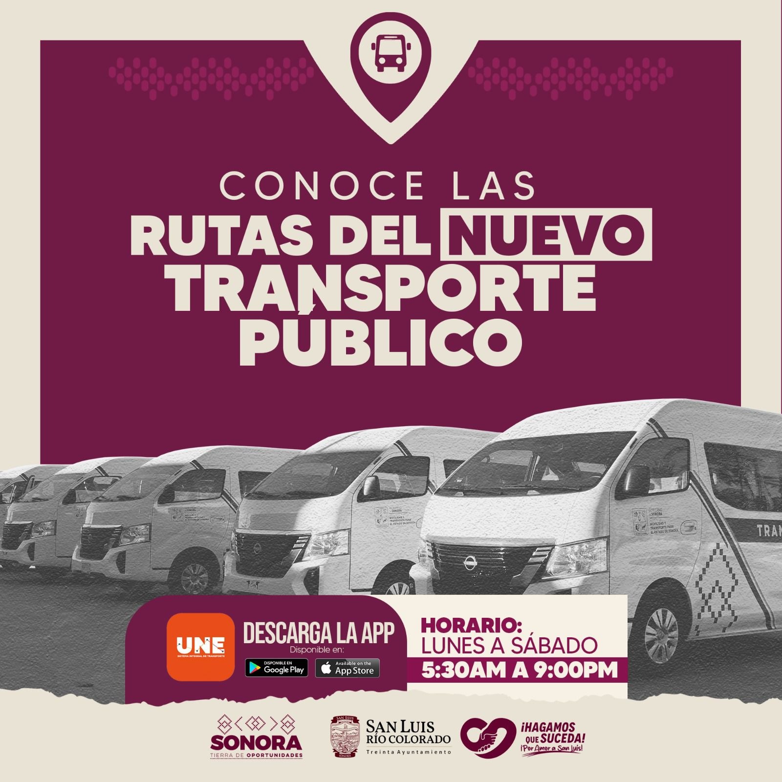 San Luis RÃo Colorado, Sonora (Febrero 12 de 2025).- Este viernes 14 de febrero, el sistema de transporte pÃblico de San Luis RÃo Colorado darà un paso significativo con la activaciÃn de tres nuevas rutas oficiales, como parte de un esfuerzo conjunto entre el Gobierno del Estado de Sonora, encabezado por el gobernador, Alfonso Durazo MontaÃo, a travÃs del Instituto de Movilidad y Transporte de Sonora (IMTES) y el Gobierno Municipal, encabezado por el alcalde CÃsar IvÃn Sandoval GÃmez.