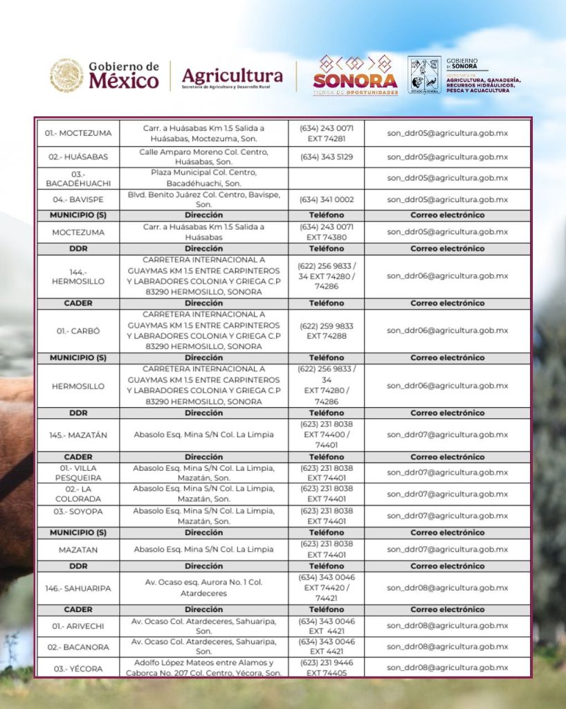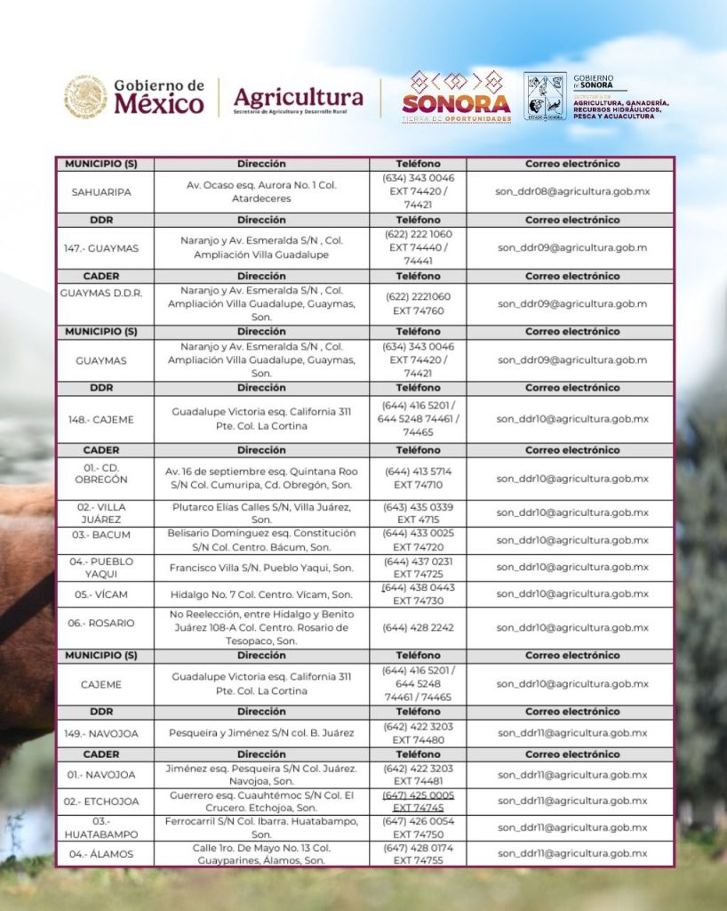 - SAGARHPA (GanaderÃa): 6622 89 52 70 â 6622 17 29 81, Ext. 113