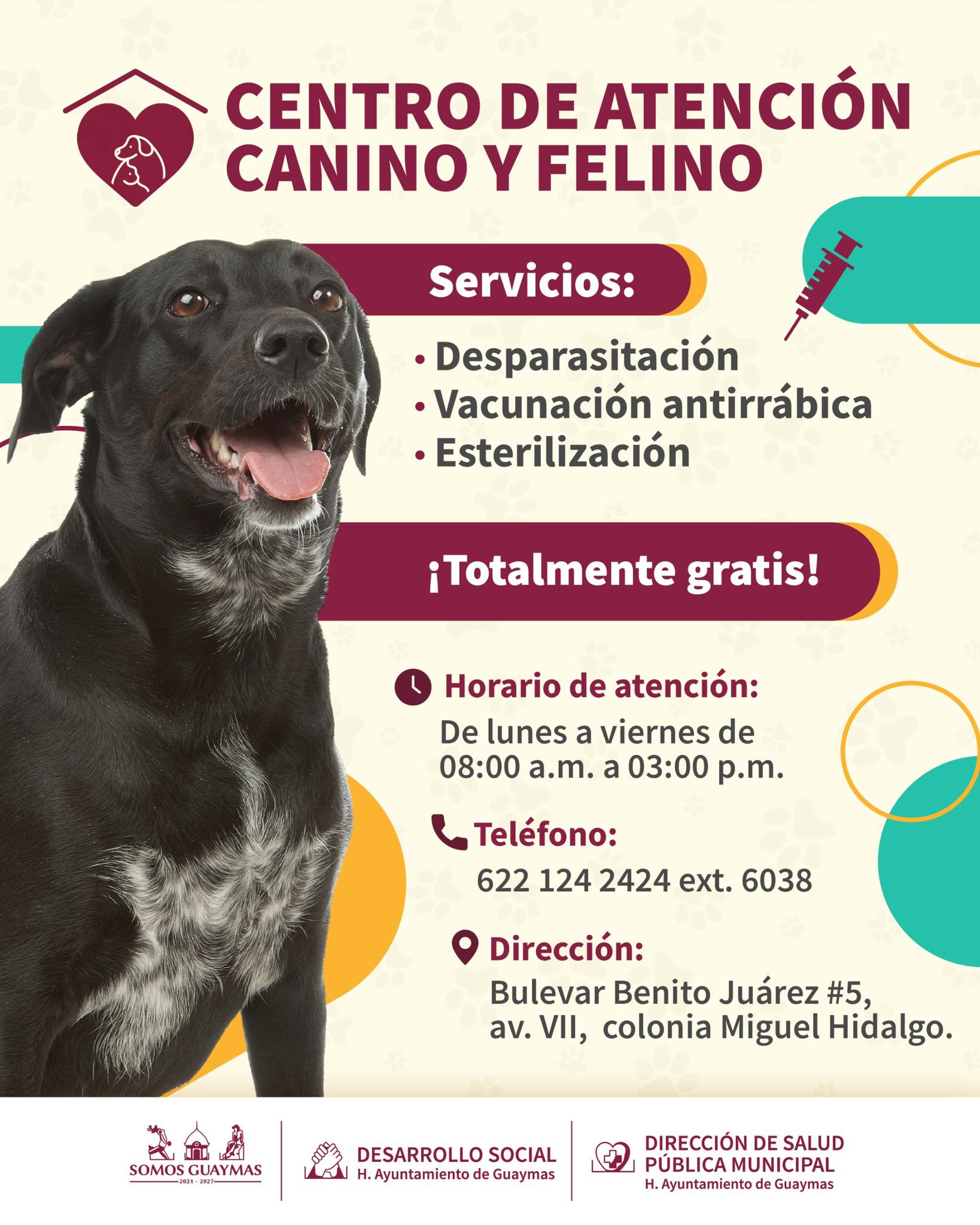 Guaymas, Sonora; a 26 de abril de 2026. Con el objetivo de promover la tenencia responsable y prevenir riesgos a la salud pública, el Ayuntamiento de Guaymas, a través de la Dirección de Salud Pública Municipal, recordó a la ciudadanía que los servicios del Centro de Atención Canino y Felino son totalmente gratuitos y permanentes.