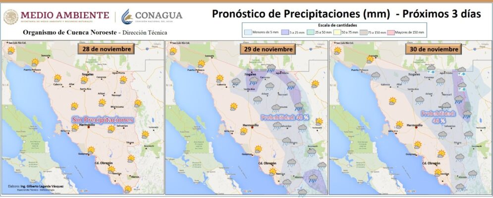 El especialista tÃcnico de la ComisiÃn Nacional del Agua en Sonora (Conagua) mencionà que se prevà un 40 por ciento de posibilidad de precipitaciones para estas zonas y valores de temperaturas menores a los 35 grados centÃgrados.