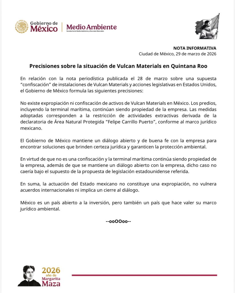 Ciudad de MÃxico; a 29 de marzo del 2026.- La SecretarÃa de Medio Ambiente y Recursos Naturales (Semarnat) emitià una postura oficial respecto al conflicto con la empresa estadounidense Vulcan Materials en Quintana Roo. El Gobierno de MÃxico rechazà categÃricamente las acusaciones de «confiscaciÃn» o «expropiaciÃn» de activos que motivaron la reciente aprobaciÃn de sanciones por parte de la CÃmara de Representantes de Estados Unidos.