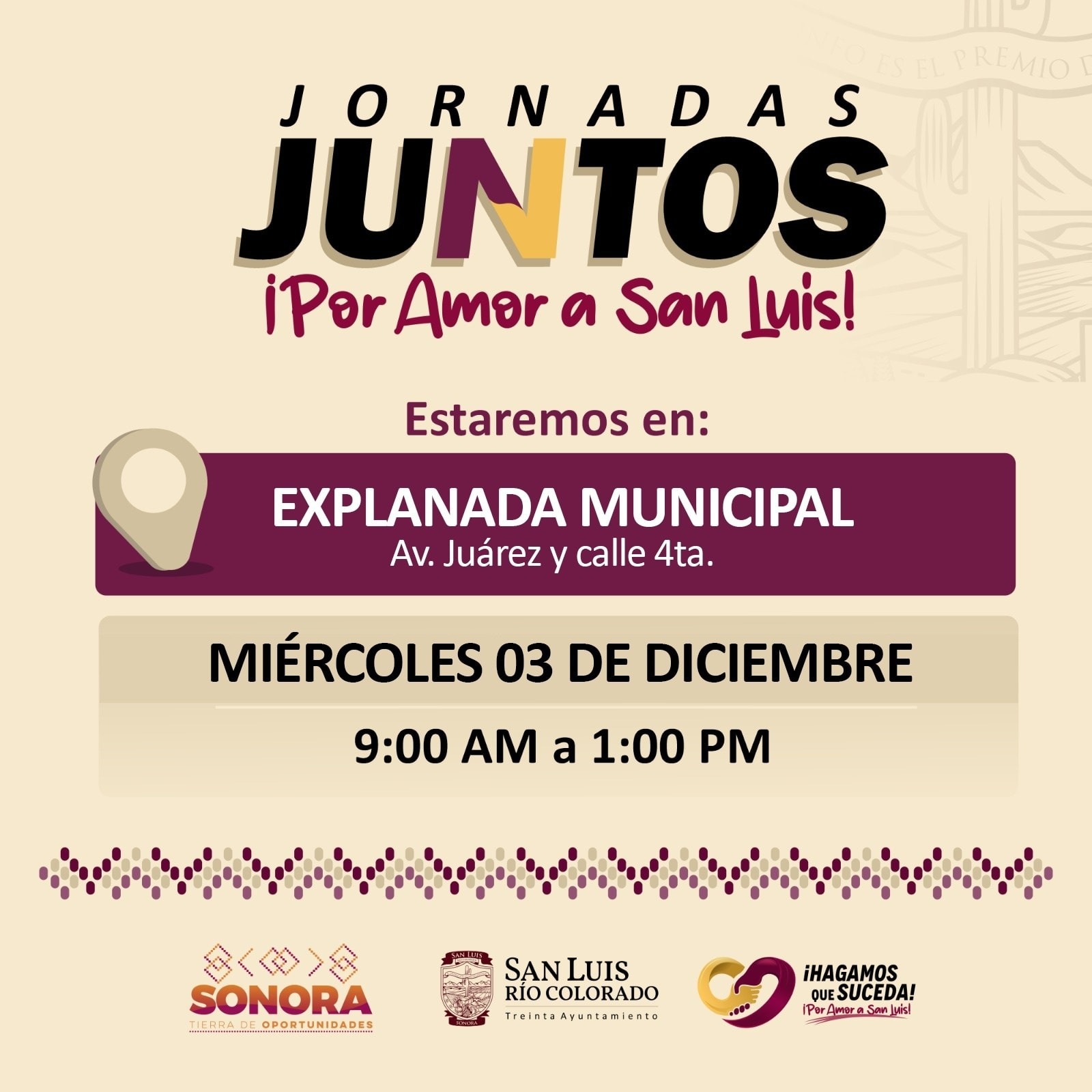 San Luis RÃo Colorado, Sonora (01 de diciembre de 2025).- Como parte del esfuerzo permanente por llevar servicios y apoyos directamente a la ciudadanÃa, el 30 Ayuntamiento continÃa recorriendo la ciudad con sus jornadas de atenciÃn comunitaria. Serà la Explanada Municipal el prÃximo punto de las jornadas âJuntos por amor a San Luisâ, este miÃrcoles 03 de diciembre.