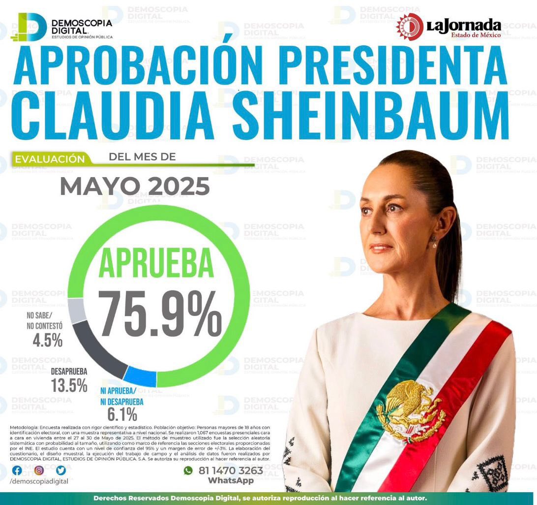 Una encuesta nacional realizada por la firma Demoscopia Digital revela que la presidenta de MÃxico, Claudia Sheinbaum Pardo, cuenta con un 75.9% de aprobaciÃn a nivel nacional. En Sonora, el respaldo a su gestiÃn es aÃn mÃs alto, alcanzando el 80.4%, ubicando al estado como el tercero con mayor apoyo popular en el paÃs.