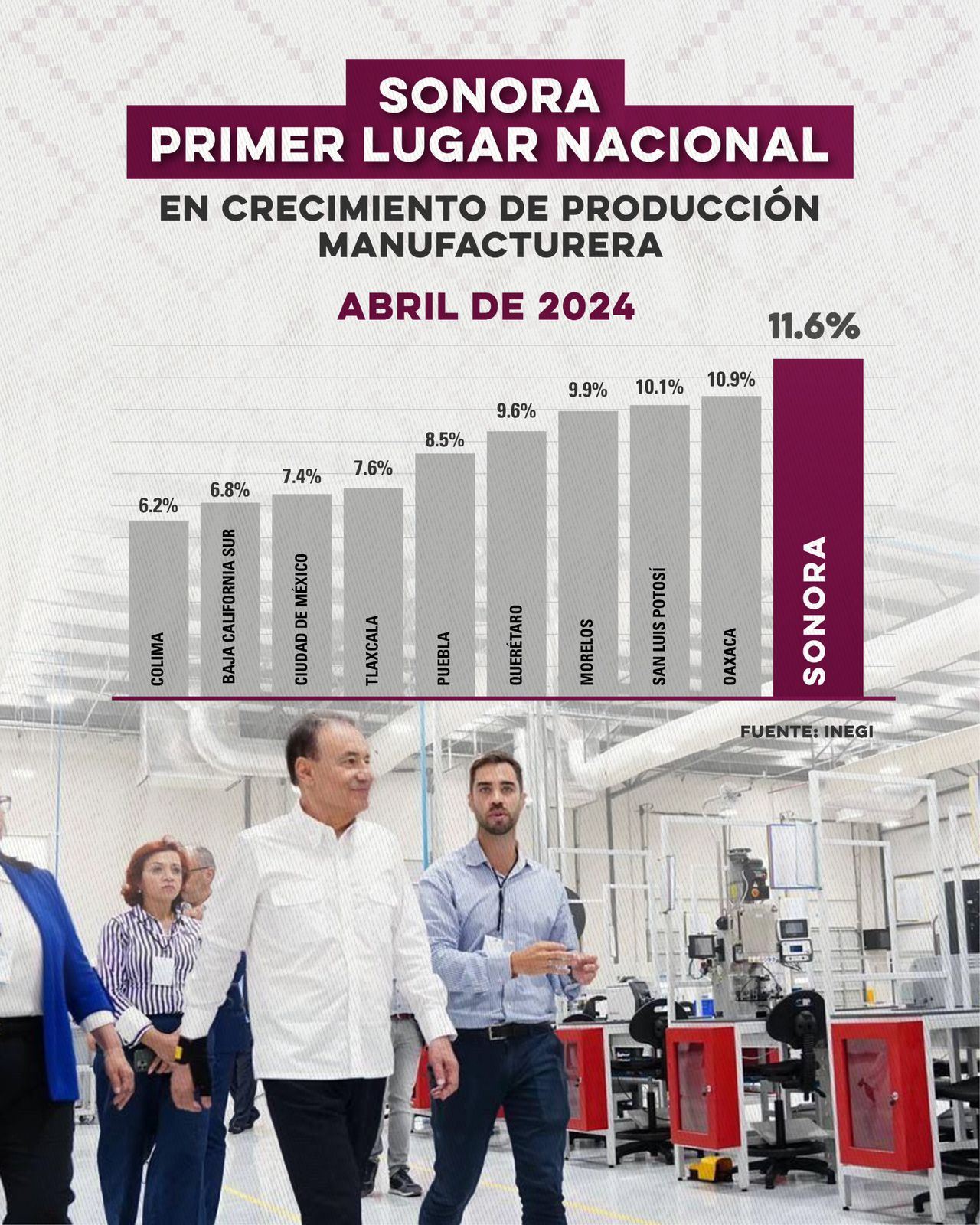 El jefe del Ejecutivo estatal destacà que, segÃn el Indicador Mensual de la Actividad Industrial por Entidad Federativa (IMAIEF), con estas cifras la entidad registra el mayor crecimiento entre las 32 entidades federativas del paÃs para el mes de abril, el mayor en toda la historia de Sonora al pasar de 108 a 121 puntos en el indicador manufacturero.