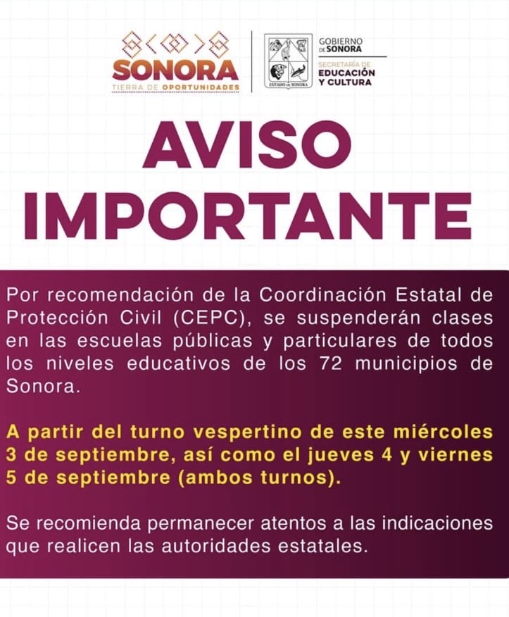 Hermosillo, Sonora | MiÃrcoles 3 de septiembre de 2025.- La SecretarÃa de EducaciÃn y Cultura (SEC) informà que, por recomendaciÃn de la CoordinaciÃn Estatal de ProtecciÃn Civil (CEPC), se suspenden clases en escuelas pÃblicas y privadas de todos los niveles educativos en los 72 municipios de Sonora.