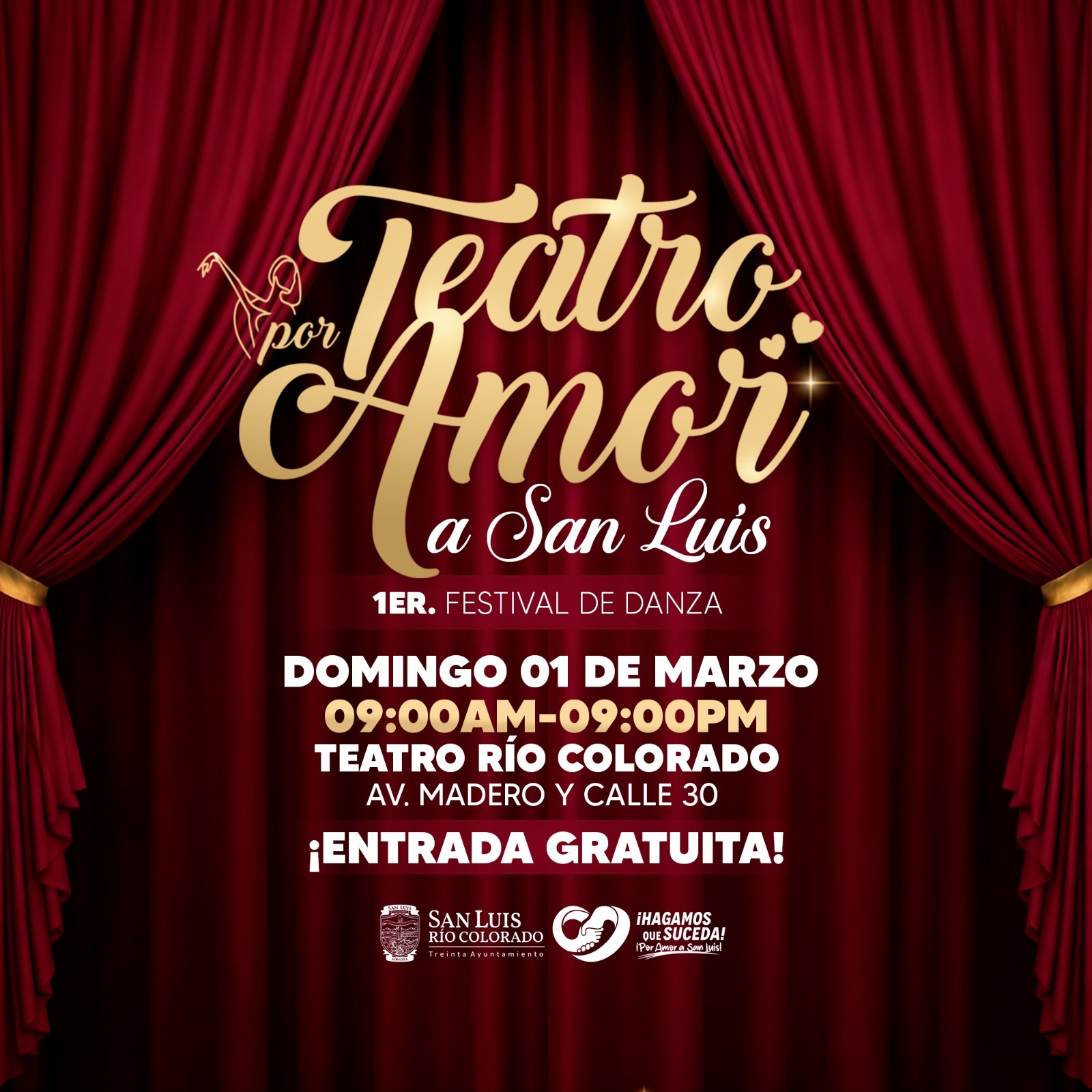 San Luis RÃo Colorado, Sonora (20 de febrero de 2026).- En el marco del DÃa de la Familia, que se conmemora el prÃximo 1 de marzo, el Gobierno Municipal, a travÃs de la DirecciÃn de Cultura Municipal, invita a la ciudadanÃa a disfrutar del programa cultural âTeatro por Amor a San Luisâ, el cual en esta ediciÃn estarà dedicado a la danza y se llevarà a cabo en el Teatro RÃo Colorado con funciones continuas de 9:00 de la maÃana a 9:00 de la noche.