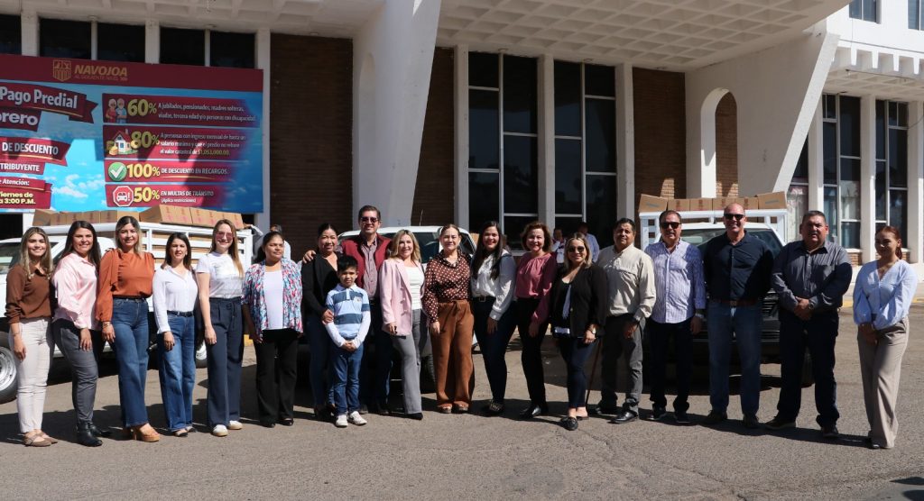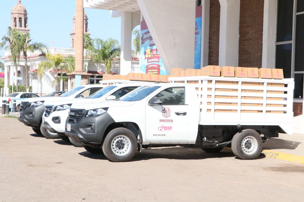 Navojoa, Sonora, 27 de febrero 2026.- Para reforzar la operatividad en sus programas de asistencia social, el Sistema DIF recibió este viernes tres pick ups nuevas entregadas oficialmente por el alcalde Jorge Alberto Elías Retes a la presidenta de la institución, Luz Argel Gaxiola de Elías, agradeciendo a los navojoenses por hacer posible estos avances con el pago de impuestos.