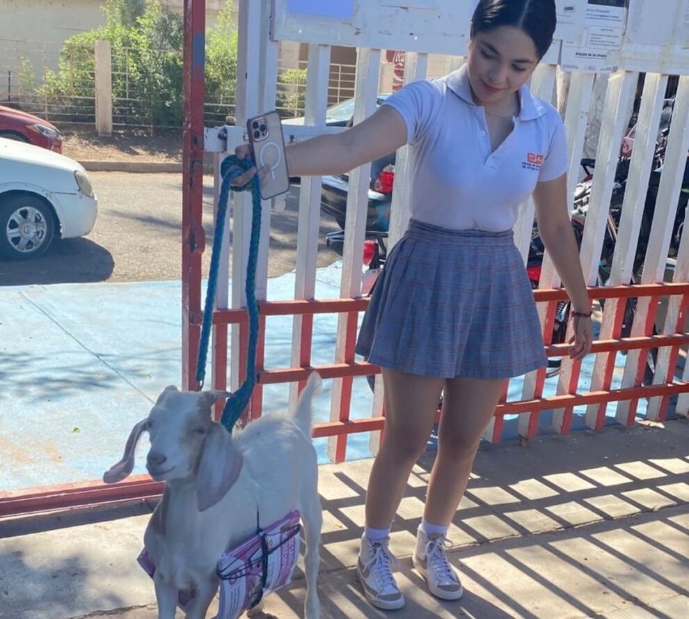 En el marco del âDÃa de la Mochila Locaâ, celebrado como parte de la Semana del Estudiante en el Colegio de Bachilleres (Cobach), plantel Pueblo Yaqui, una joven destacà con una propuesta tan inesperada como adorable: usà a su chivito como mochila.