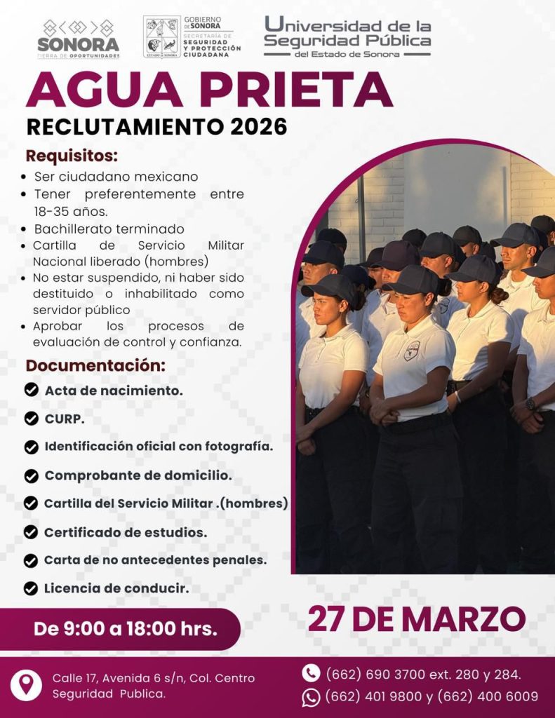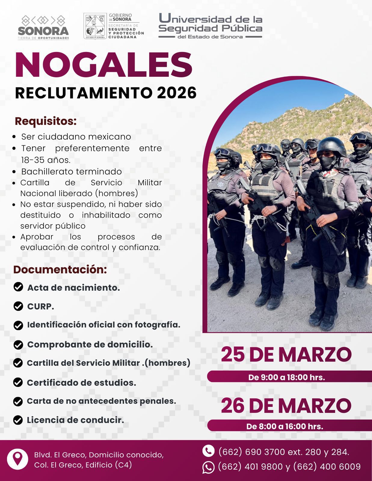 La SecretarÃa de Seguridad y ProtecciÃn Ciudadana (SSPC) Sonora, a travÃs de la USP, estarà presente en los municipios de Nogales y Agua Prieta para reclutar perfiles que deseen prepararse acadÃmicamente como parte de la generaciÃn âEspartaâ.